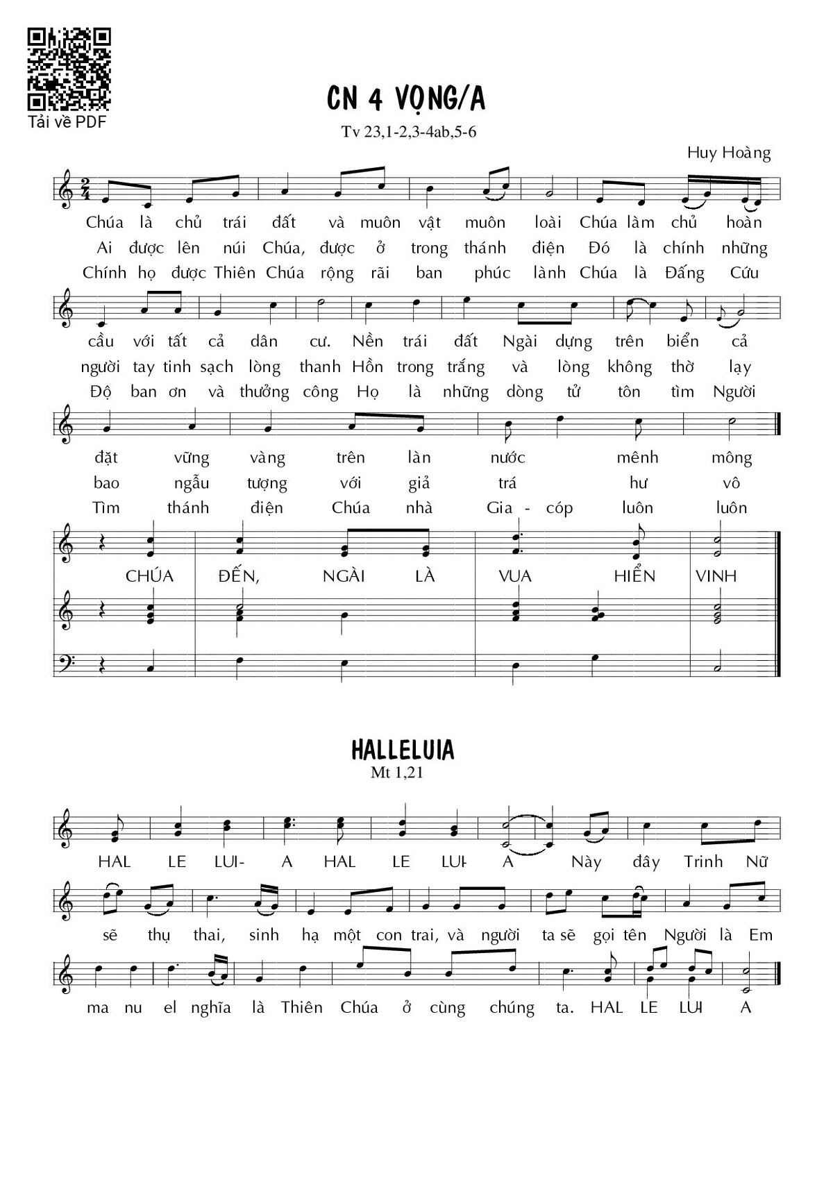 Sheet nhạc có nốt Chúa nhật 4A Mùa Vọng của nhạc sĩ Huy Hoàng và file PDF nốt nhạc đăng lên đây nhằm giúp các bạn xướng âm cho đúng nốt và hát thêm hay, chỉ mang tính chất tham khảo, không có mục đích thương mại. Bản quyền thuộc về tác giả và tổ chức nắm bản quyền, Truongca.com không giữ bất kỳ bản quyền của nội dung nào cả. Các bạn có thể tải về bản PDF chất lượng cao, gồm khuông nhạc có nốt với đường link file PDF bên trên.