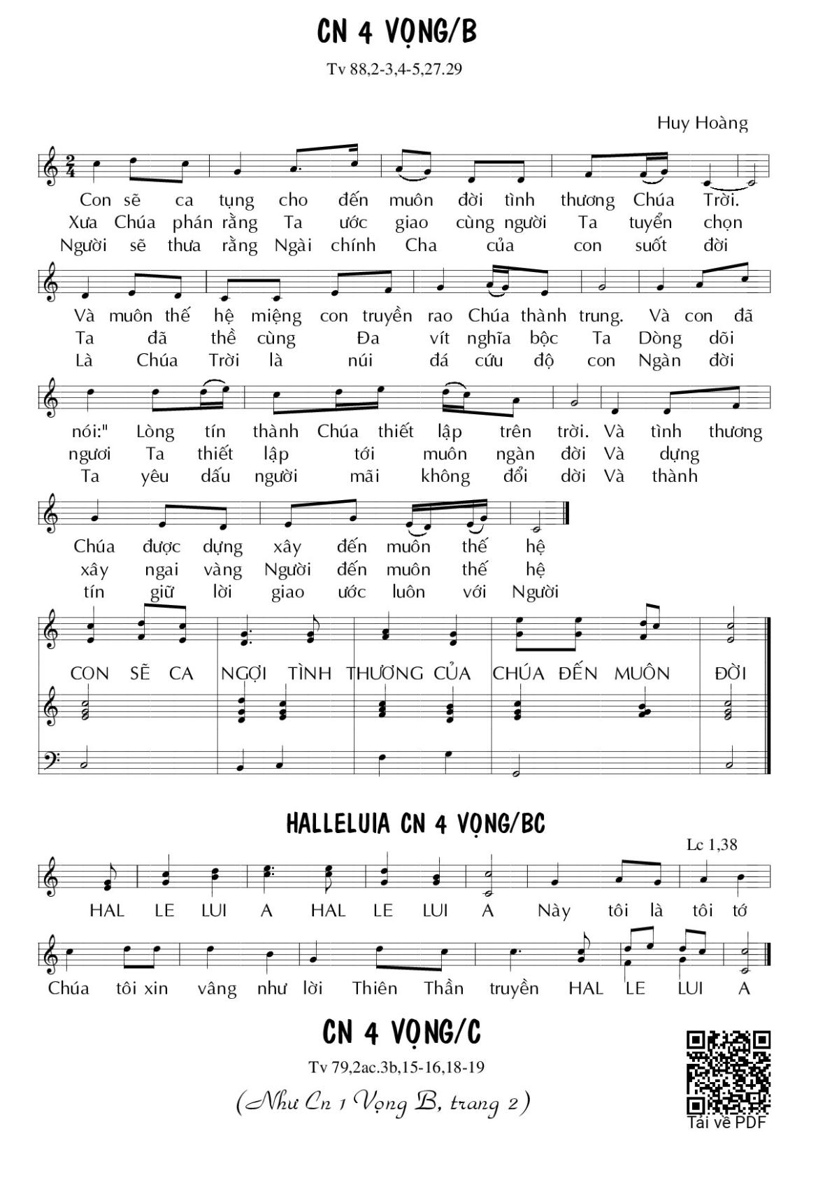 Sheet nhạc có nốt Chúa nhật 4B Mùa Vọng của nhạc sĩ Huy Hoàng và file PDF nốt nhạc đăng lên đây nhằm giúp các bạn xướng âm cho đúng nốt và hát thêm hay, chỉ mang tính chất tham khảo, không có mục đích thương mại. Bản quyền thuộc về tác giả và tổ chức nắm bản quyền, Truongca.com không giữ bất kỳ bản quyền của nội dung nào cả. Các bạn có thể tải về bản PDF chất lượng cao, gồm khuông nhạc có nốt với đường link file PDF bên trên.