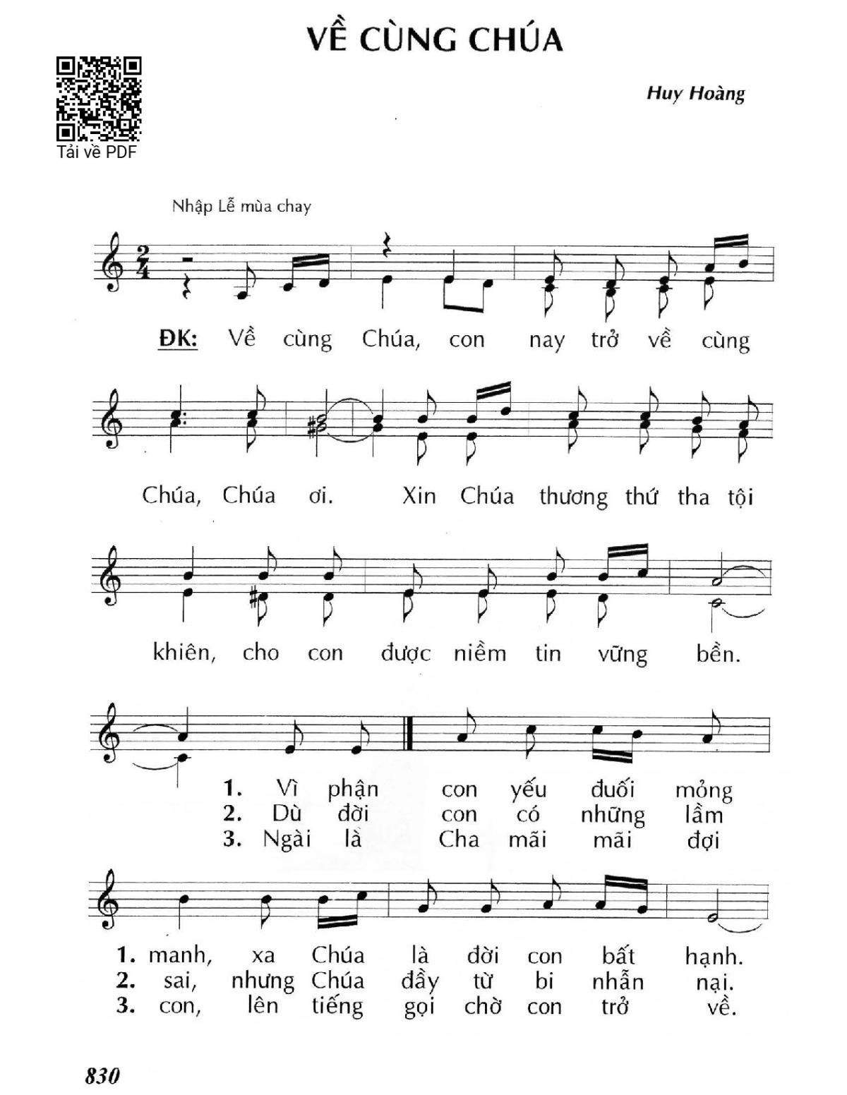 Sheet nhạc có nốt Về cùng Chúa của nhạc sĩ Huy Hoàng và file PDF nốt nhạc đăng lên đây nhằm giúp các bạn xướng âm cho đúng nốt và hát thêm hay, chỉ mang tính chất tham khảo, không có mục đích thương mại. Bản quyền thuộc về tác giả và tổ chức nắm bản quyền, Truongca.com không giữ bất kỳ bản quyền của nội dung nào cả. Các bạn có thể tải về bản PDF chất lượng cao, gồm khuông nhạc có nốt với đường link file PDF bên trên.