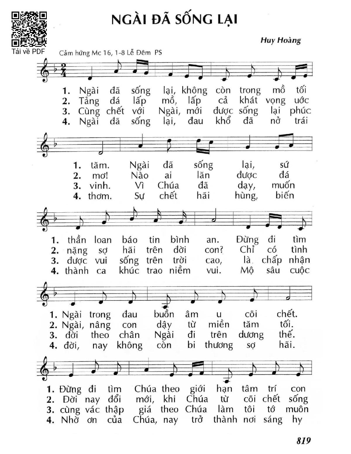Sheet nhạc có nốt Ngài đã sống lại của nhạc sĩ Huy Hoàng và file PDF nốt nhạc đăng lên đây nhằm giúp các bạn xướng âm cho đúng nốt và hát thêm hay, chỉ mang tính chất tham khảo, không có mục đích thương mại. Bản quyền thuộc về tác giả và tổ chức nắm bản quyền, Truongca.com không giữ bất kỳ bản quyền của nội dung nào cả. Các bạn có thể tải về bản PDF chất lượng cao, gồm khuông nhạc có nốt với đường link file PDF bên trên.