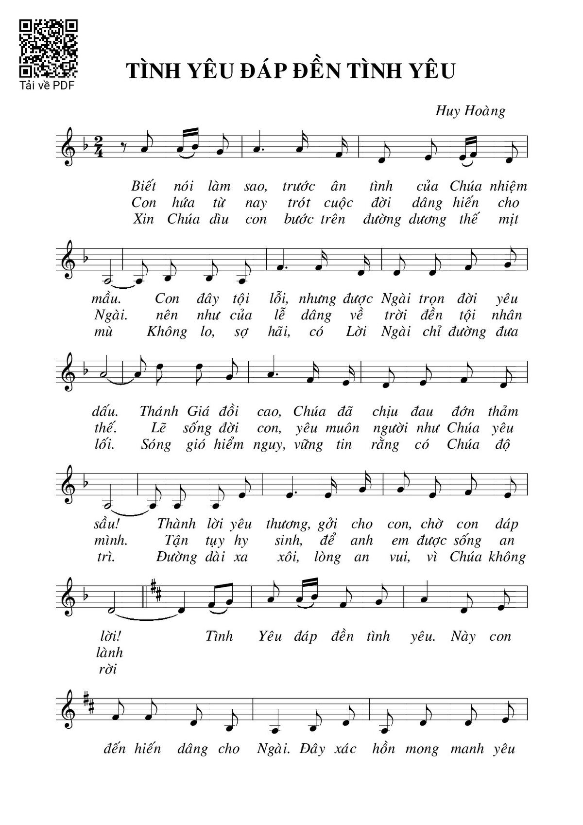 Sheet nhạc có nốt Tình yêu đáp đền tình yêu của nhạc sĩ Huy Hoàng và file PDF nốt nhạc đăng lên đây nhằm giúp các bạn xướng âm cho đúng nốt và hát thêm hay, chỉ mang tính chất tham khảo, không có mục đích thương mại. Bản quyền thuộc về tác giả và tổ chức nắm bản quyền, Truongca.com không giữ bất kỳ bản quyền của nội dung nào cả. Các bạn có thể tải về bản PDF chất lượng cao, gồm khuông nhạc có nốt với đường link file PDF bên trên.