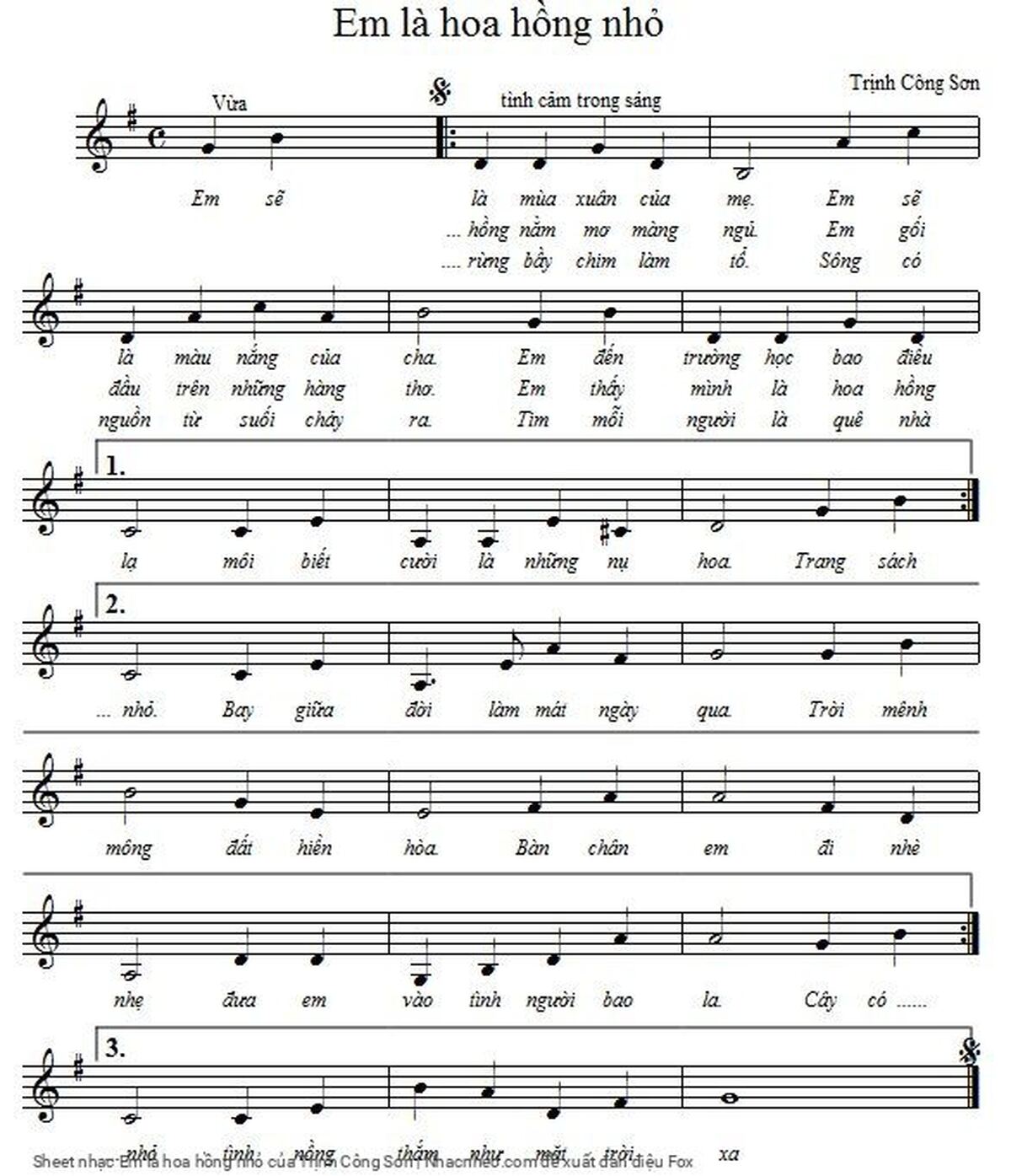 Phần nghe hát Em là hoa hồng nhỏ (Trịnh Công Sơn) được nhúng từ Youtube, Musescore hoặc link ngoài và chịu sự kiểm soát bản quyền của bên thứ ba đó, vì vậy có thể bị xóa hoặc chèn quảng cáo bất kỳ lúc nào. Nếu bạn không nghe - xem được ca sĩ hát tức là đã bị Youtube hoặc Musescore kiểm soát.