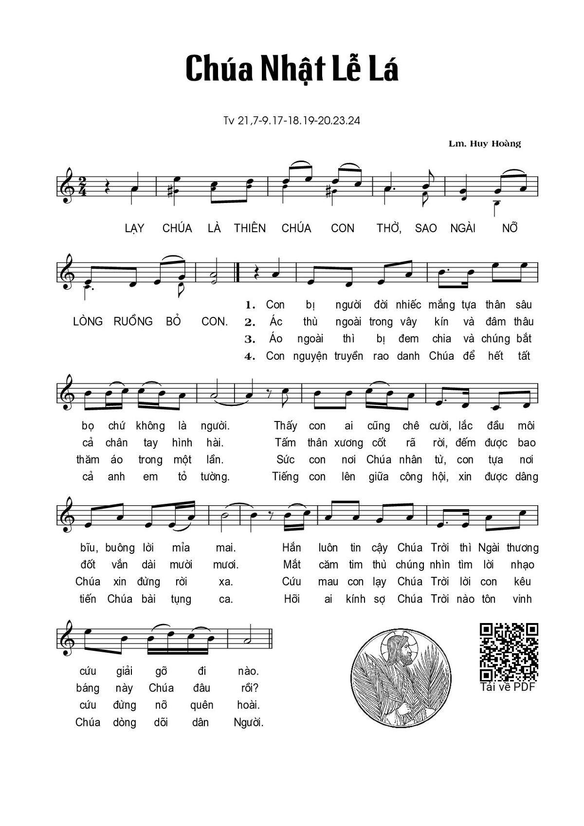 Sheet nhạc có nốt Chúa Nhật Lễ Lá của nhạc sĩ Huy Hoàng và file PDF nốt nhạc đăng lên đây nhằm giúp các bạn xướng âm cho đúng nốt và hát thêm hay, chỉ mang tính chất tham khảo, không có mục đích thương mại. Bản quyền thuộc về tác giả và tổ chức nắm bản quyền, Truongca.com không giữ bất kỳ bản quyền của nội dung nào cả. Các bạn có thể tải về bản PDF chất lượng cao, gồm khuông nhạc có nốt với đường link file PDF bên trên.