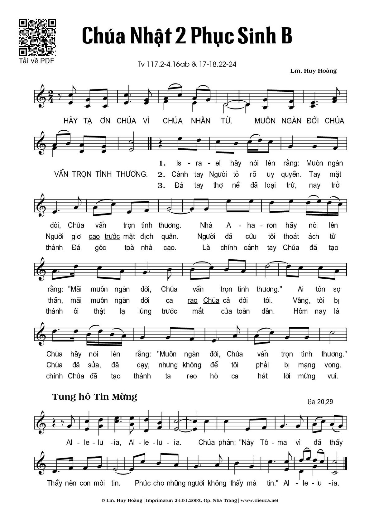 Sheet nhạc có nốt Chúa Nhật 2A Phục Sinh của nhạc sĩ Huy Hoàng và file PDF nốt nhạc đăng lên đây nhằm giúp các bạn xướng âm cho đúng nốt và hát thêm hay, chỉ mang tính chất tham khảo, không có mục đích thương mại. Bản quyền thuộc về tác giả và tổ chức nắm bản quyền, Truongca.com không giữ bất kỳ bản quyền của nội dung nào cả. Các bạn có thể tải về bản PDF chất lượng cao, gồm khuông nhạc có nốt với đường link file PDF bên trên.