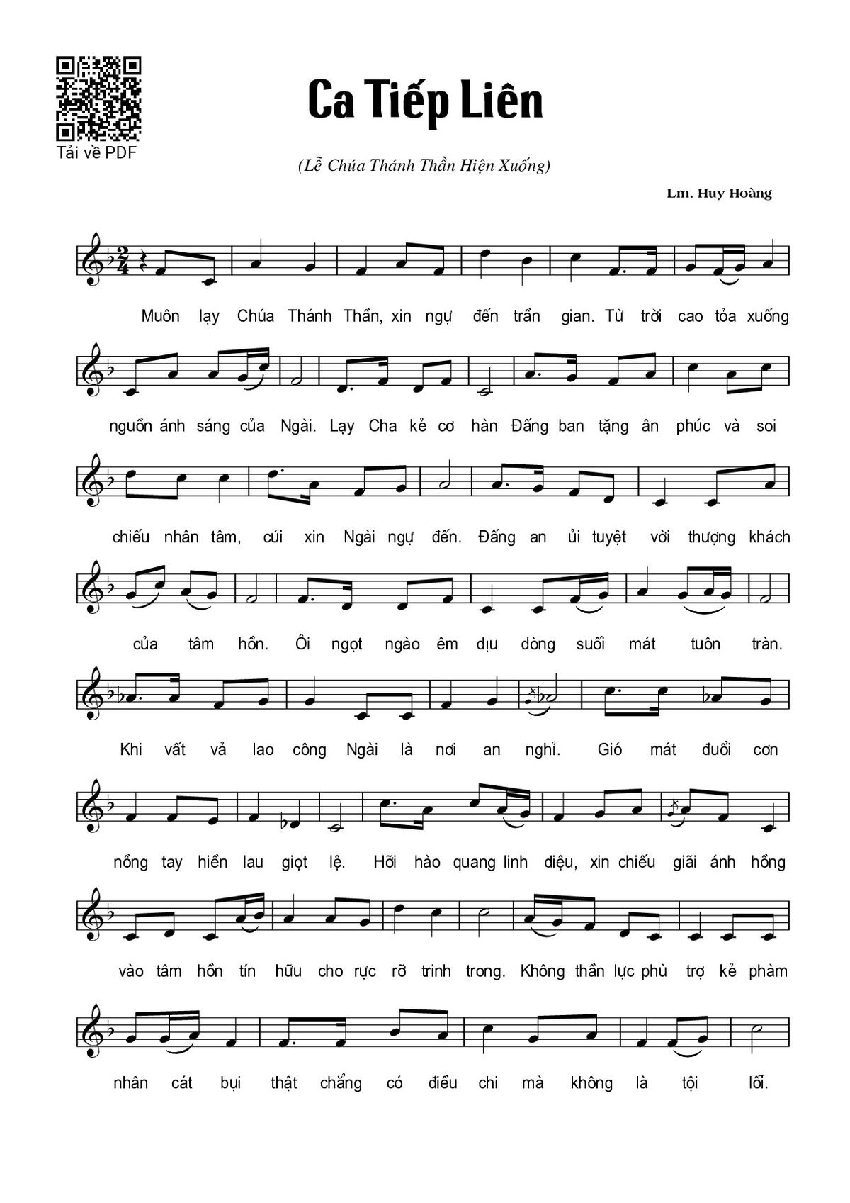Sheet nhạc có nốt Lễ Hiện Xuống của nhạc sĩ Huy Hoàng và file PDF nốt nhạc đăng lên đây nhằm giúp các bạn xướng âm cho đúng nốt và hát thêm hay, chỉ mang tính chất tham khảo, không có mục đích thương mại. Bản quyền thuộc về tác giả và tổ chức nắm bản quyền, Truongca.com không giữ bất kỳ bản quyền của nội dung nào cả. Các bạn có thể tải về bản PDF chất lượng cao, gồm khuông nhạc có nốt với đường link file PDF bên trên.