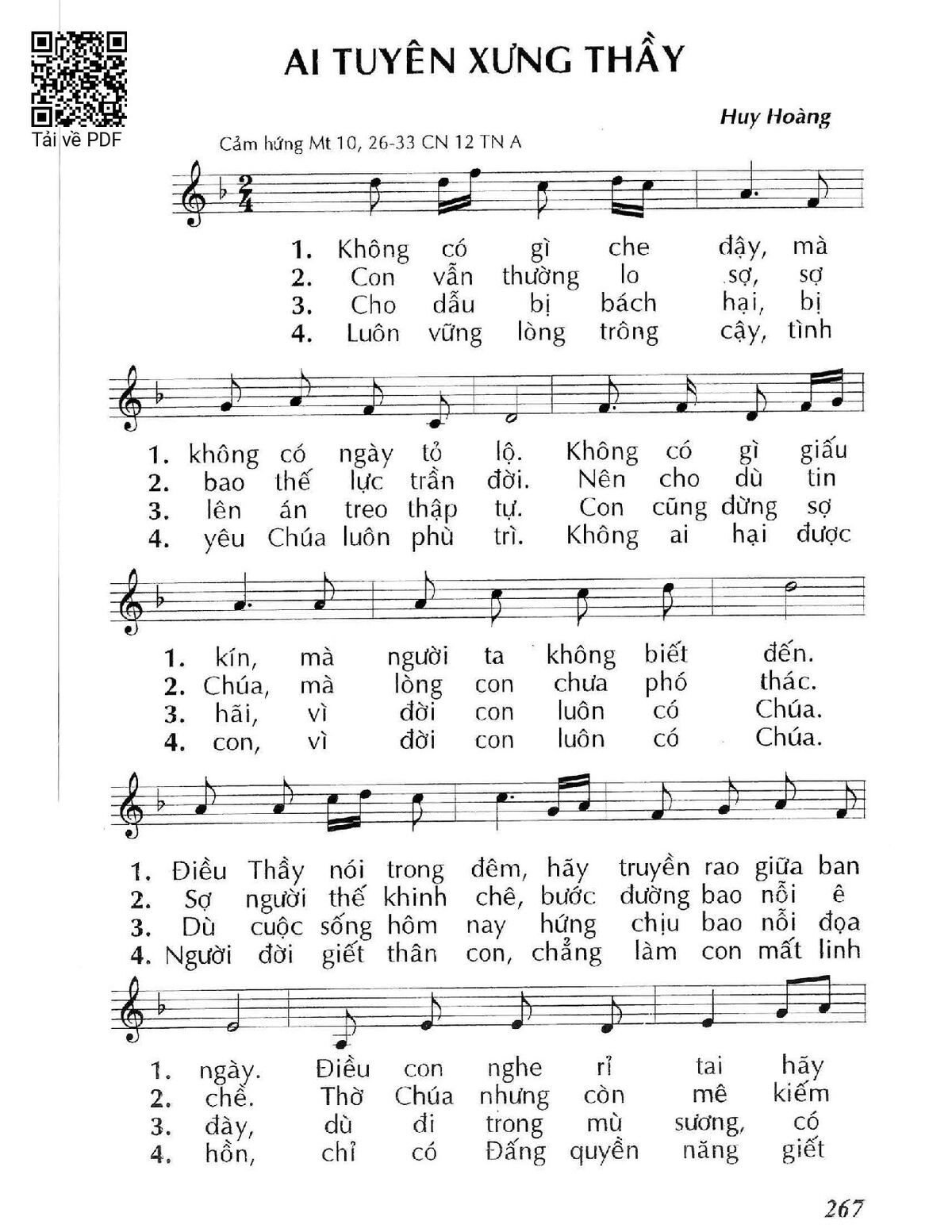 Sheet nhạc có nốt Ai tuyên xưng Thầy của nhạc sĩ Huy Hoàng và file PDF nốt nhạc đăng lên đây nhằm giúp các bạn xướng âm cho đúng nốt và hát thêm hay, chỉ mang tính chất tham khảo, không có mục đích thương mại. Bản quyền thuộc về tác giả và tổ chức nắm bản quyền, Truongca.com không giữ bất kỳ bản quyền của nội dung nào cả. Các bạn có thể tải về bản PDF chất lượng cao, gồm khuông nhạc có nốt với đường link file PDF bên trên.