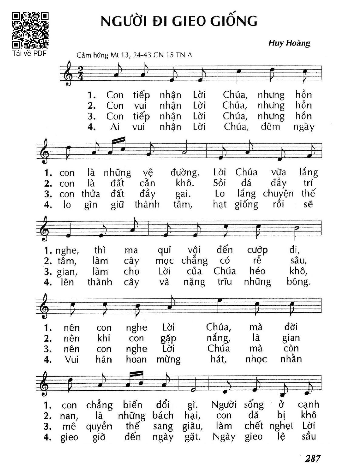 Sheet nhạc có nốt Người đi gieo giống của nhạc sĩ Huy Hoàng và file PDF nốt nhạc đăng lên đây nhằm giúp các bạn xướng âm cho đúng nốt và hát thêm hay, chỉ mang tính chất tham khảo, không có mục đích thương mại. Bản quyền thuộc về tác giả và tổ chức nắm bản quyền, Truongca.com không giữ bất kỳ bản quyền của nội dung nào cả. Các bạn có thể tải về bản PDF chất lượng cao, gồm khuông nhạc có nốt với đường link file PDF bên trên.