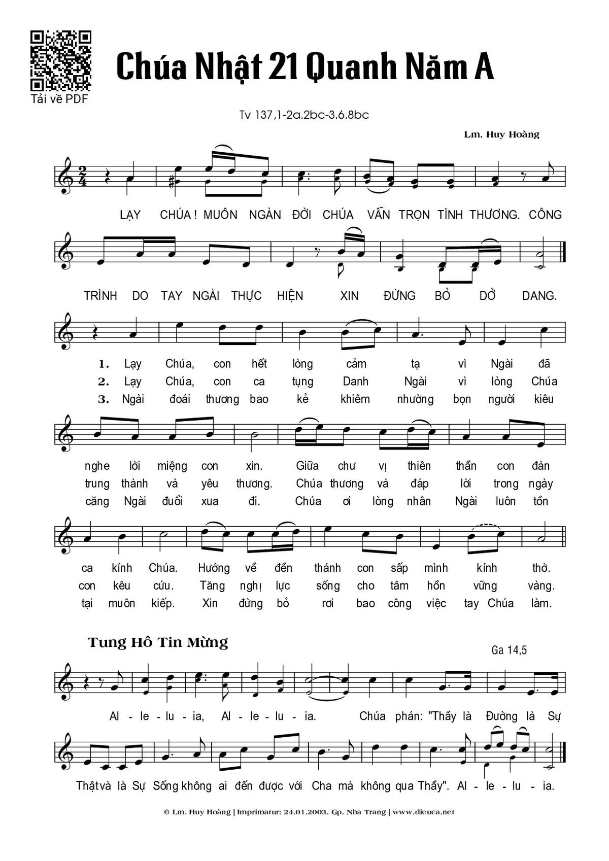 Sheet nhạc có nốt Chúa Nhật 21A Thường Niên của nhạc sĩ Huy Hoàng và file PDF nốt nhạc đăng lên đây nhằm giúp các bạn xướng âm cho đúng nốt và hát thêm hay, chỉ mang tính chất tham khảo, không có mục đích thương mại. Bản quyền thuộc về tác giả và tổ chức nắm bản quyền, Truongca.com không giữ bất kỳ bản quyền của nội dung nào cả. Các bạn có thể tải về bản PDF chất lượng cao, gồm khuông nhạc có nốt với đường link file PDF bên trên.
