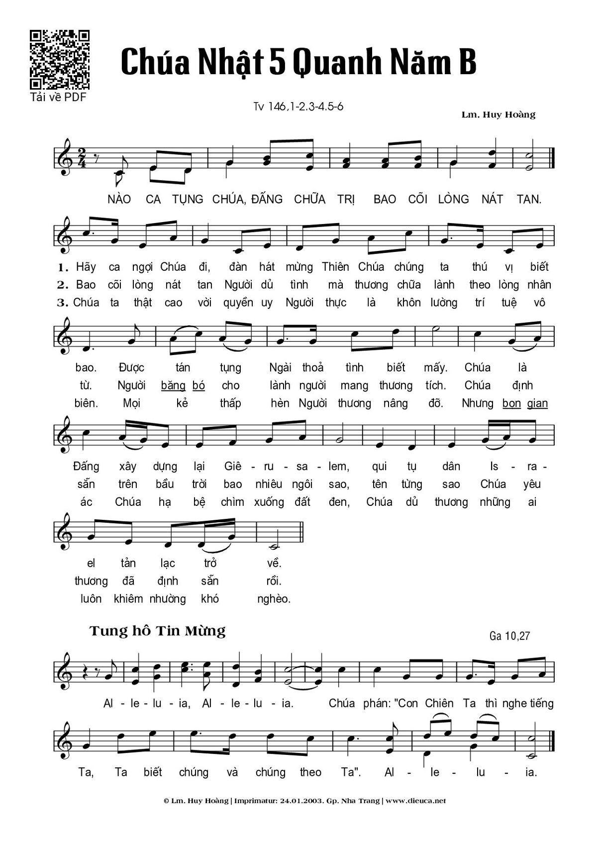 Sheet nhạc có nốt Chúa Nhật 5B Thường Niên (Thánh Vịnh 146) của nhạc sĩ Huy Hoàng và file PDF nốt nhạc đăng lên đây nhằm giúp các bạn xướng âm cho đúng nốt và hát thêm hay, chỉ mang tính chất tham khảo, không có mục đích thương mại. Bản quyền thuộc về tác giả và tổ chức nắm bản quyền, Truongca.com không giữ bất kỳ bản quyền của nội dung nào cả. Các bạn có thể tải về bản PDF chất lượng cao, gồm khuông nhạc có nốt với đường link file PDF bên trên.