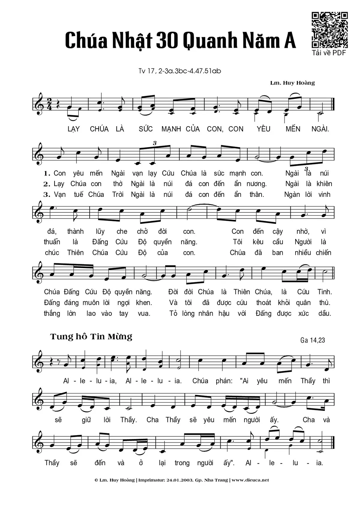 Sheet nhạc có nốt Chúa Nhật 30A Thường Niên (Thánh Vịnh 17) của nhạc sĩ Huy Hoàng và file PDF nốt nhạc đăng lên đây nhằm giúp các bạn xướng âm cho đúng nốt và hát thêm hay, chỉ mang tính chất tham khảo, không có mục đích thương mại. Bản quyền thuộc về tác giả và tổ chức nắm bản quyền, Truongca.com không giữ bất kỳ bản quyền của nội dung nào cả. Các bạn có thể tải về bản PDF chất lượng cao, gồm khuông nhạc có nốt với đường link file PDF bên trên.