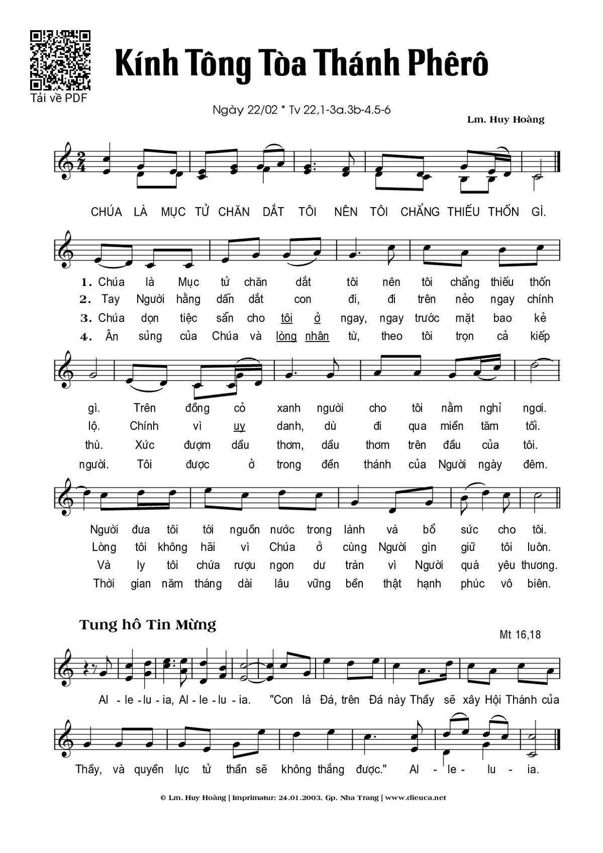 Sheet nhạc có nốt Kính Tông Tòa Thánh Phê-rô (22.02) của nhạc sĩ Huy Hoàng và file PDF nốt nhạc đăng lên đây nhằm giúp các bạn xướng âm cho đúng nốt và hát thêm hay, chỉ mang tính chất tham khảo, không có mục đích thương mại. Bản quyền thuộc về tác giả và tổ chức nắm bản quyền, Truongca.com không giữ bất kỳ bản quyền của nội dung nào cả. Các bạn có thể tải về bản PDF chất lượng cao, gồm khuông nhạc có nốt với đường link file PDF bên trên.