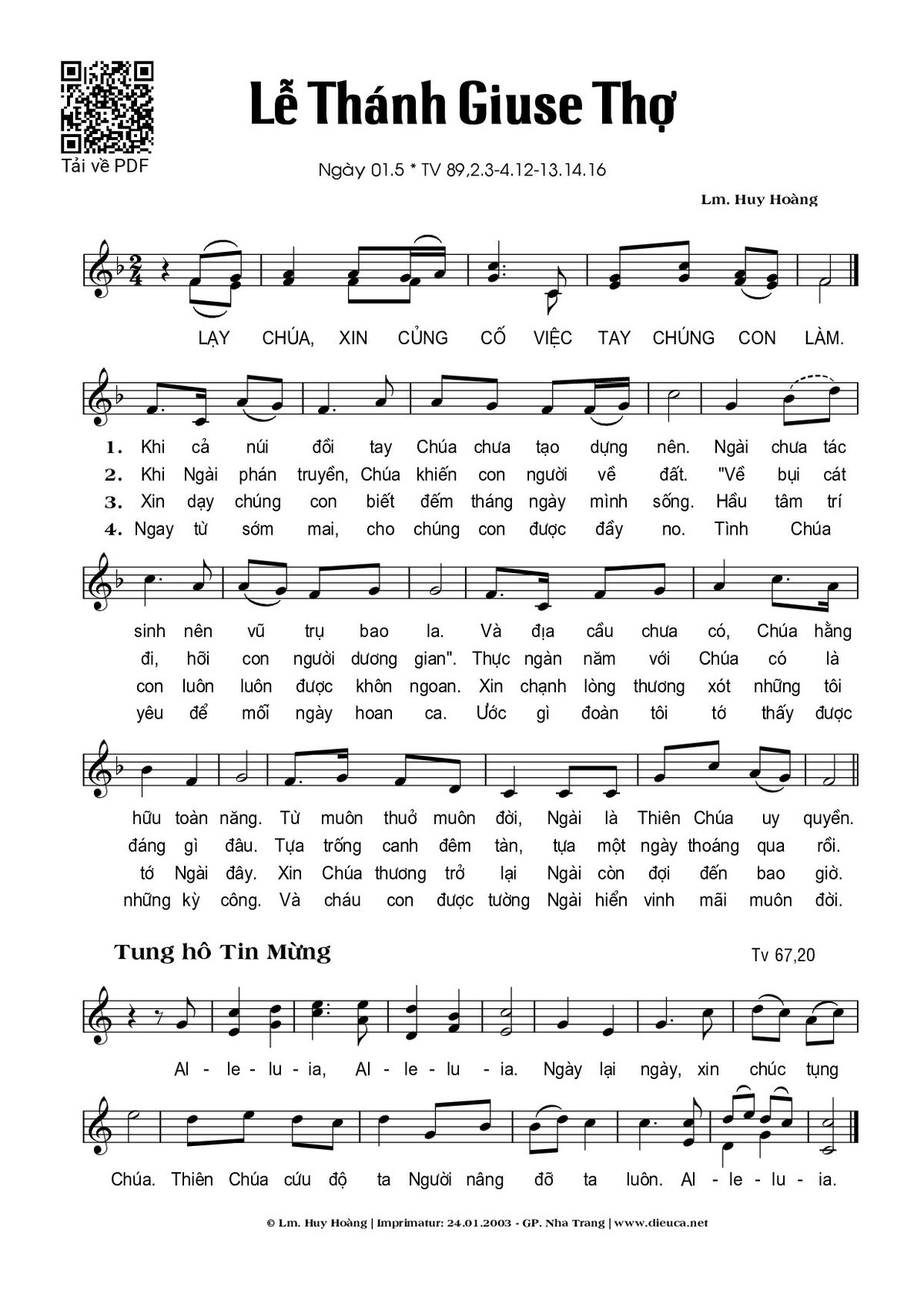Sheet nhạc có nốt Thánh Giuse Thợ (01.05) của nhạc sĩ Huy Hoàng và file PDF nốt nhạc đăng lên đây nhằm giúp các bạn xướng âm cho đúng nốt và hát thêm hay, chỉ mang tính chất tham khảo, không có mục đích thương mại. Bản quyền thuộc về tác giả và tổ chức nắm bản quyền, Truongca.com không giữ bất kỳ bản quyền của nội dung nào cả. Các bạn có thể tải về bản PDF chất lượng cao, gồm khuông nhạc có nốt với đường link file PDF bên trên.