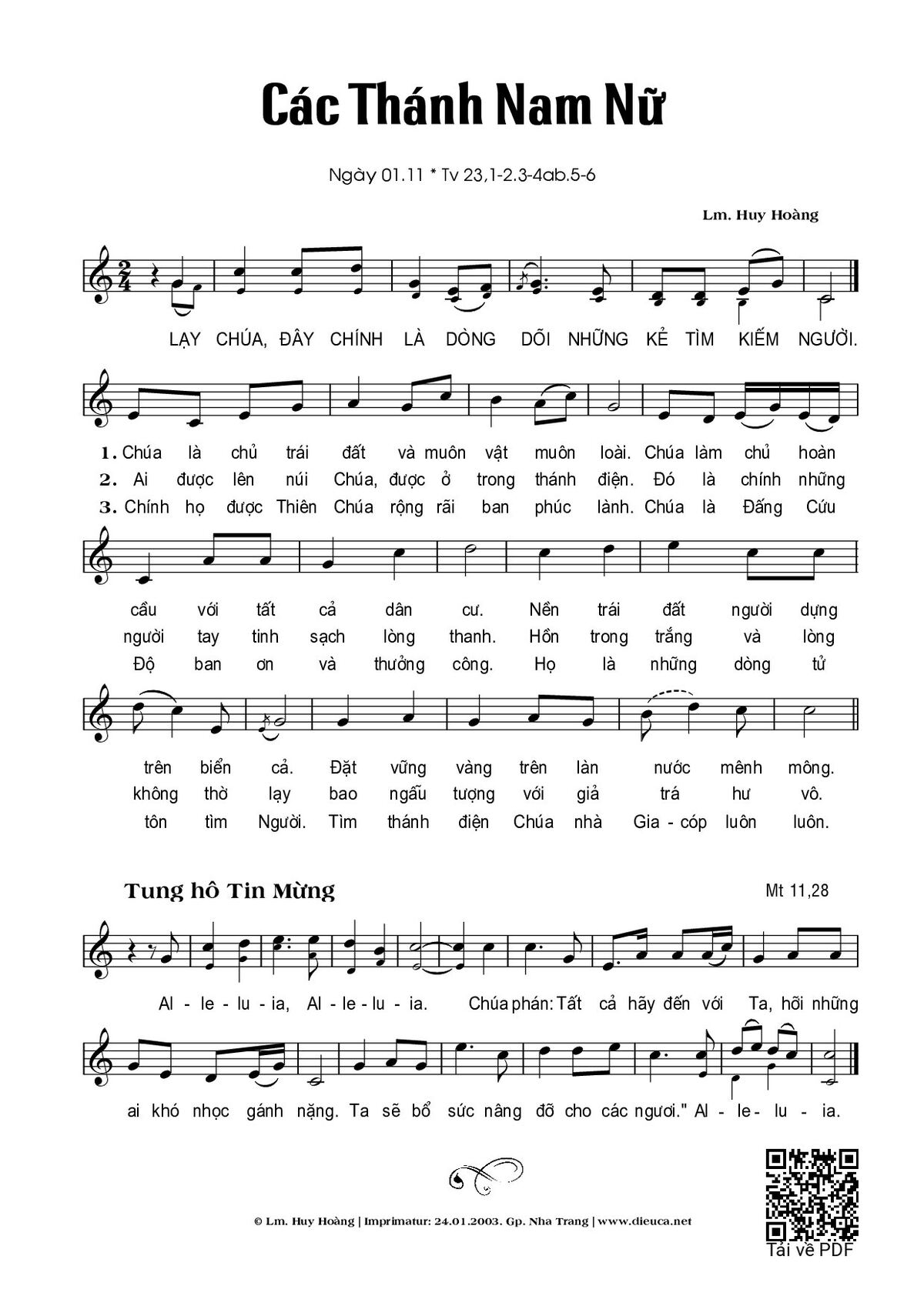 Sheet nhạc có nốt Các Thánh Nam Nữ (01.11) của nhạc sĩ Huy Hoàng và file PDF nốt nhạc đăng lên đây nhằm giúp các bạn xướng âm cho đúng nốt và hát thêm hay, chỉ mang tính chất tham khảo, không có mục đích thương mại. Bản quyền thuộc về tác giả và tổ chức nắm bản quyền, Truongca.com không giữ bất kỳ bản quyền của nội dung nào cả. Các bạn có thể tải về bản PDF chất lượng cao, gồm khuông nhạc có nốt với đường link file PDF bên trên.