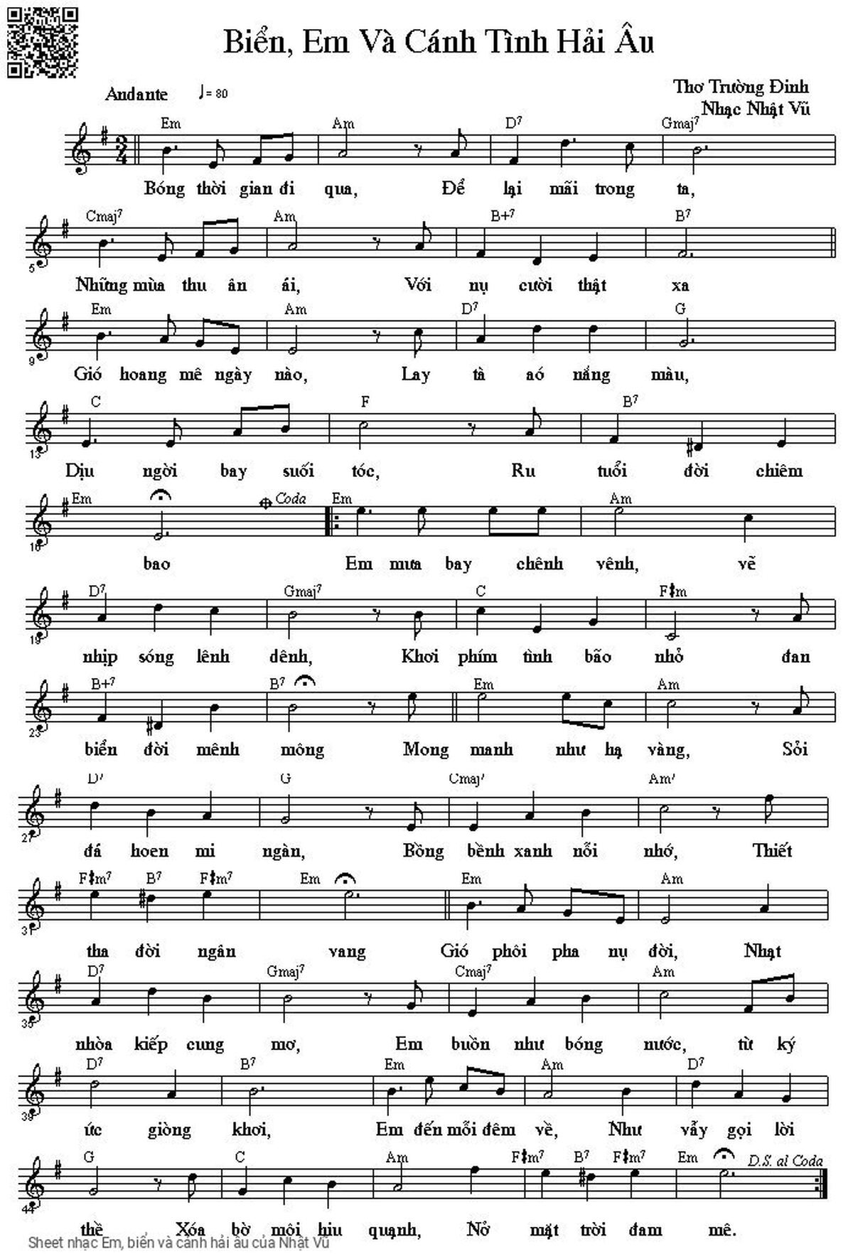 Phần nghe hát Em, biển và cánh hải âu (Nhật Vũ) được nhúng từ Youtube, Musescore hoặc link ngoài và chịu sự kiểm soát bản quyền của bên thứ ba đó, vì vậy có thể bị xóa hoặc chèn quảng cáo bất kỳ lúc nào. Nếu bạn không nghe - xem được ca sĩ hát tức là đã bị Youtube hoặc Musescore kiểm soát.