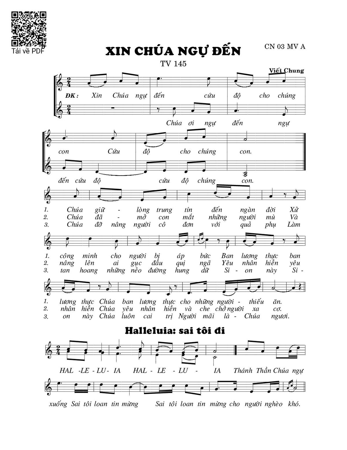 Sheet nhạc có nốt Xin Chúa ngự đến (Thánh Vịnh 145) của nhạc sĩ Viết Chung và file PDF nốt nhạc đăng lên đây nhằm giúp các bạn xướng âm cho đúng nốt và hát thêm hay, chỉ mang tính chất tham khảo, không có mục đích thương mại. Bản quyền thuộc về tác giả và tổ chức nắm bản quyền, Truongca.com không giữ bất kỳ bản quyền của nội dung nào cả. Các bạn có thể tải về bản PDF chất lượng cao, gồm khuông nhạc có nốt với đường link file PDF bên trên.