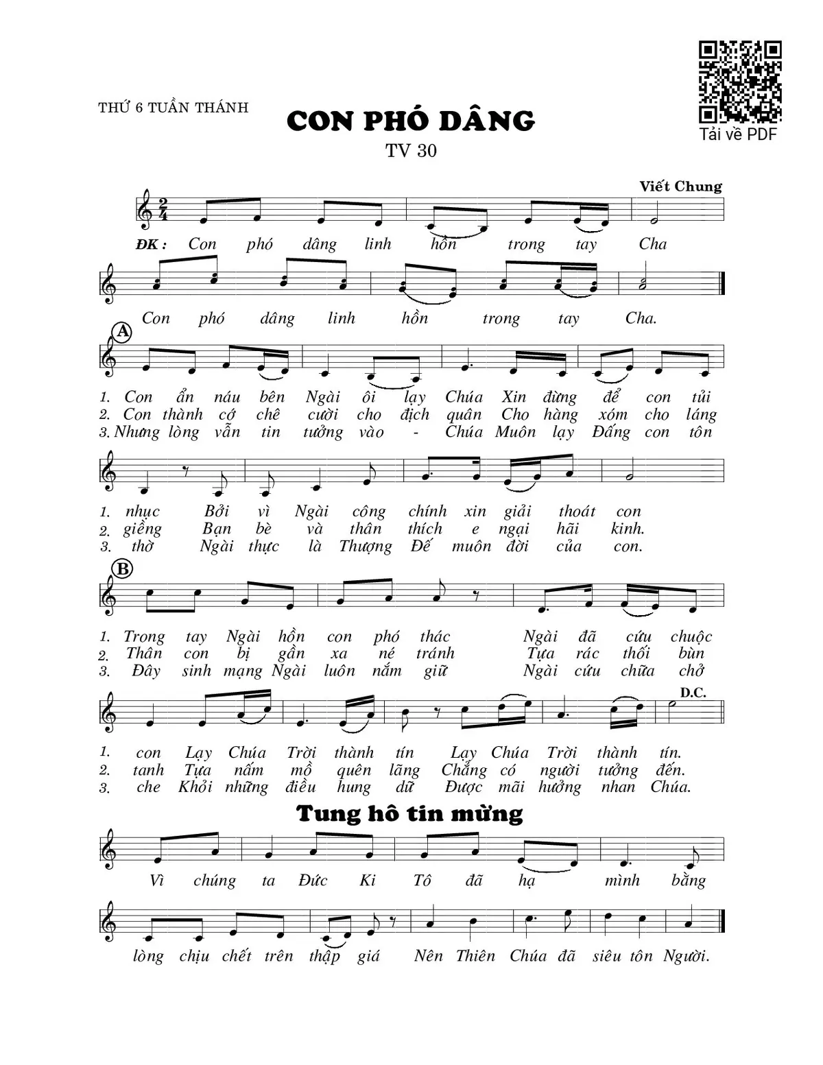 Sheet nhạc có nốt Con phó dâng (Thánh Vịnh 30) của nhạc sĩ Viết Chung và file PDF nốt nhạc đăng lên đây nhằm giúp các bạn xướng âm cho đúng nốt và hát thêm hay, chỉ mang tính chất tham khảo, không có mục đích thương mại. Bản quyền thuộc về tác giả và tổ chức nắm bản quyền, Truongca.com không giữ bất kỳ bản quyền của nội dung nào cả. Các bạn có thể tải về bản PDF chất lượng cao, gồm khuông nhạc có nốt với đường link file PDF bên trên.
