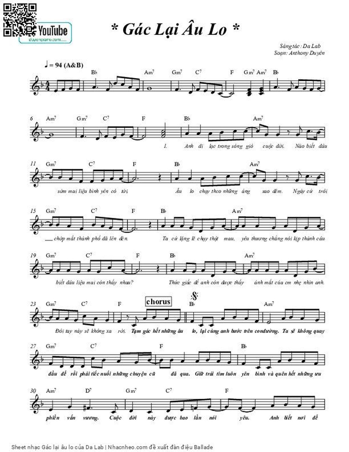 Chọn nút dấu + để tăng tông lên nửa cung, nút dấu - để giảm tông xuống nửa cung. Rê chuột vào hợp âm để xem các thế bấm hợp âm của bài hát Gác lại âu lo.