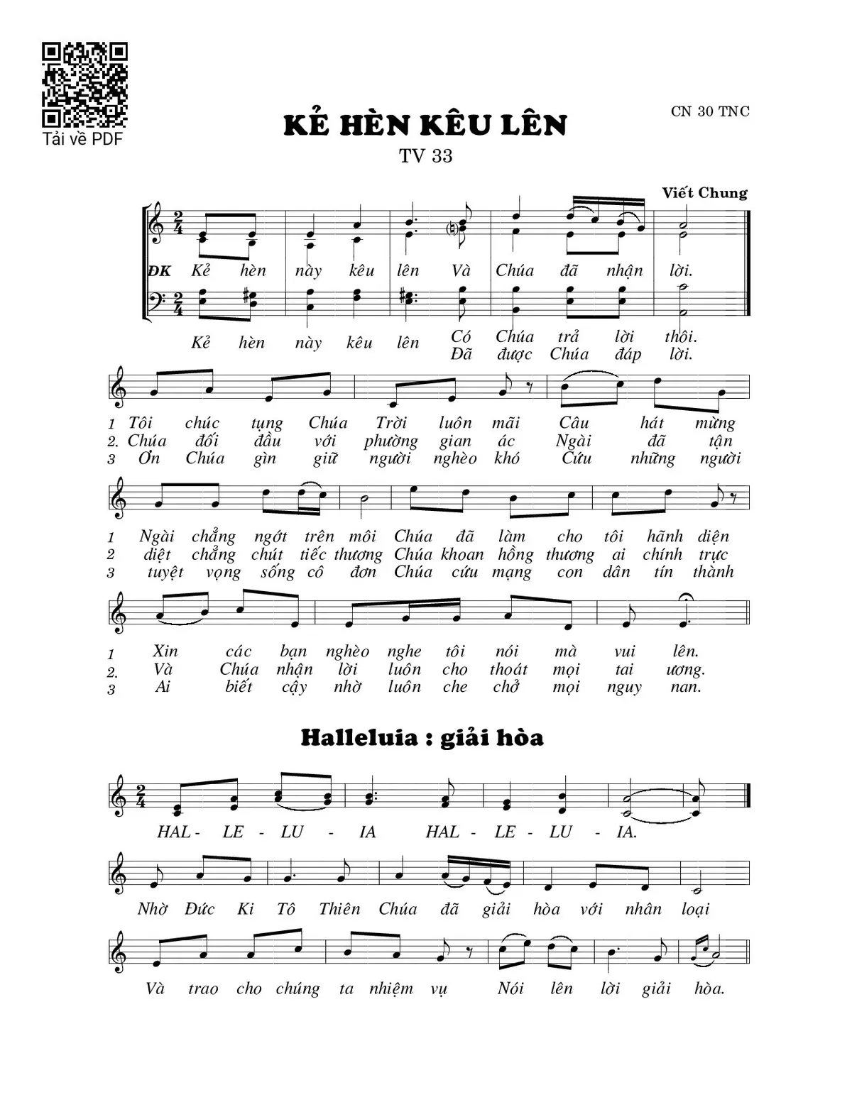 Sheet nhạc có nốt Kẻ hèn kêu lên (Thánh Vịnh 33) của nhạc sĩ Viết Chung và file PDF nốt nhạc đăng lên đây nhằm giúp các bạn xướng âm cho đúng nốt và hát thêm hay, chỉ mang tính chất tham khảo, không có mục đích thương mại. Bản quyền thuộc về tác giả và tổ chức nắm bản quyền, Truongca.com không giữ bất kỳ bản quyền của nội dung nào cả. Các bạn có thể tải về bản PDF chất lượng cao, gồm khuông nhạc có nốt với đường link file PDF bên trên.