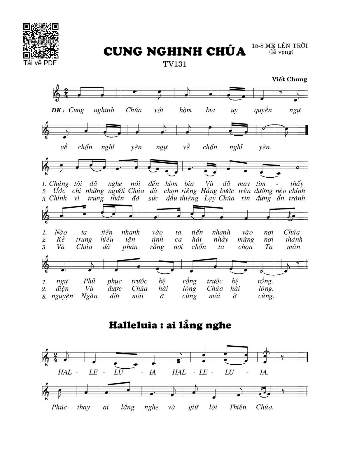 Sheet nhạc có nốt Cung nghinh Chúa (Thánh Vịnh 131) của nhạc sĩ Viết Chung và file PDF nốt nhạc đăng lên đây nhằm giúp các bạn xướng âm cho đúng nốt và hát thêm hay, chỉ mang tính chất tham khảo, không có mục đích thương mại. Bản quyền thuộc về tác giả và tổ chức nắm bản quyền, Truongca.com không giữ bất kỳ bản quyền của nội dung nào cả. Các bạn có thể tải về bản PDF chất lượng cao, gồm khuông nhạc có nốt với đường link file PDF bên trên.