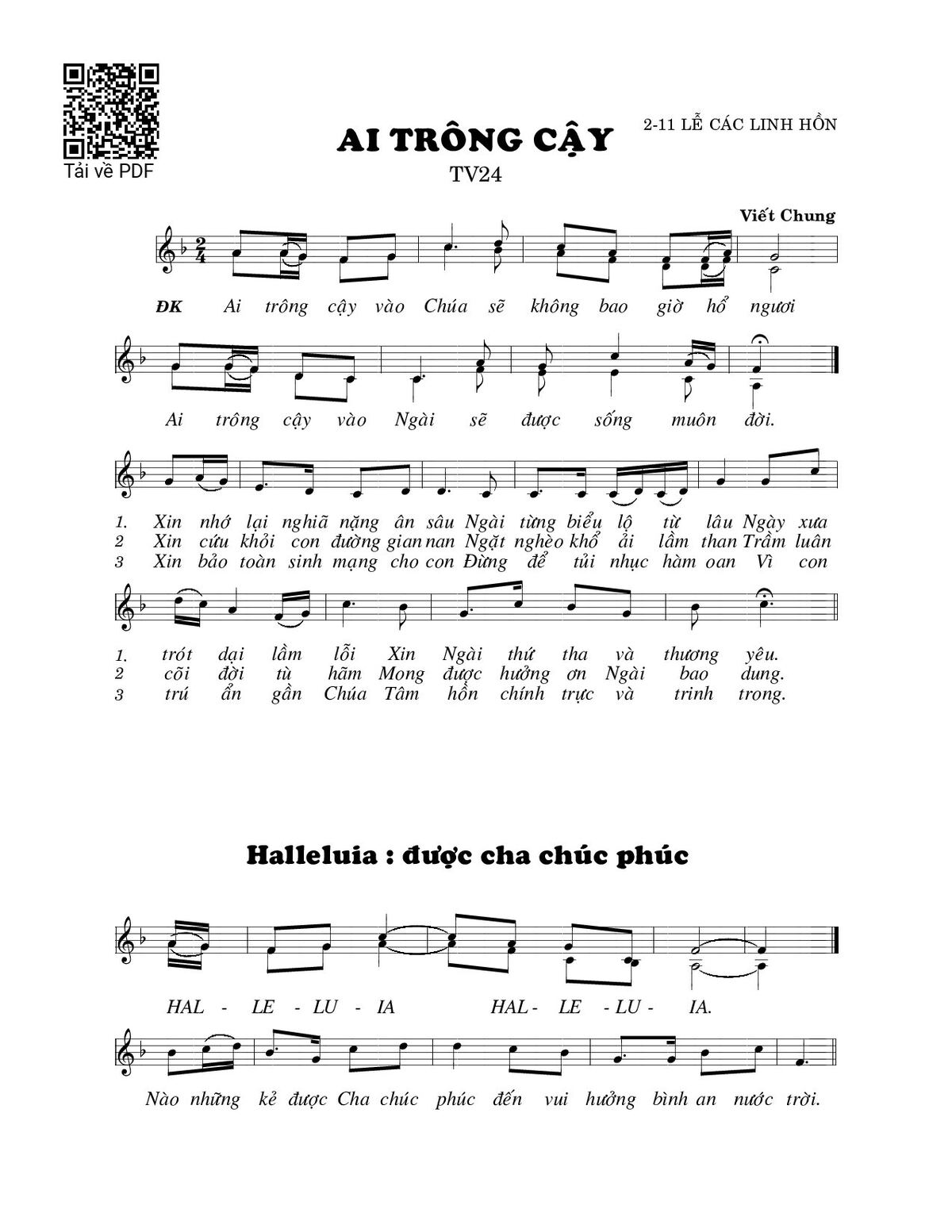 Sheet nhạc có nốt Ai trông cậy (Thánh Vịnh 26) của nhạc sĩ Viết Chung và file PDF nốt nhạc đăng lên đây nhằm giúp các bạn xướng âm cho đúng nốt và hát thêm hay, chỉ mang tính chất tham khảo, không có mục đích thương mại. Bản quyền thuộc về tác giả và tổ chức nắm bản quyền, Truongca.com không giữ bất kỳ bản quyền của nội dung nào cả. Các bạn có thể tải về bản PDF chất lượng cao, gồm khuông nhạc có nốt với đường link file PDF bên trên.
