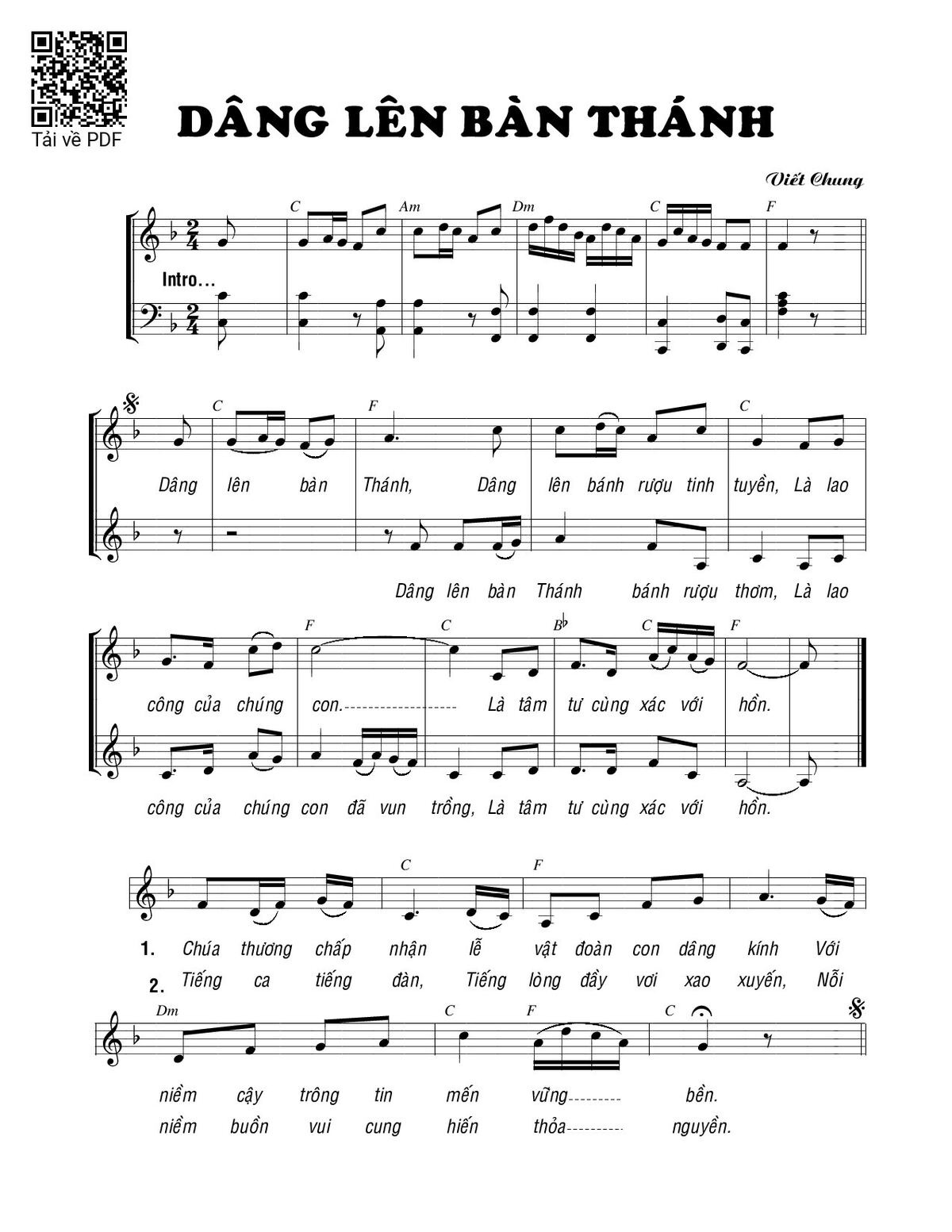 Sheet nhạc có nốt Dâng lên bàn thánh của nhạc sĩ Viết Chung và file PDF nốt nhạc đăng lên đây nhằm giúp các bạn xướng âm cho đúng nốt và hát thêm hay, chỉ mang tính chất tham khảo, không có mục đích thương mại. Bản quyền thuộc về tác giả và tổ chức nắm bản quyền, Truongca.com không giữ bất kỳ bản quyền của nội dung nào cả. Các bạn có thể tải về bản PDF chất lượng cao, gồm khuông nhạc có nốt với đường link file PDF bên trên.
