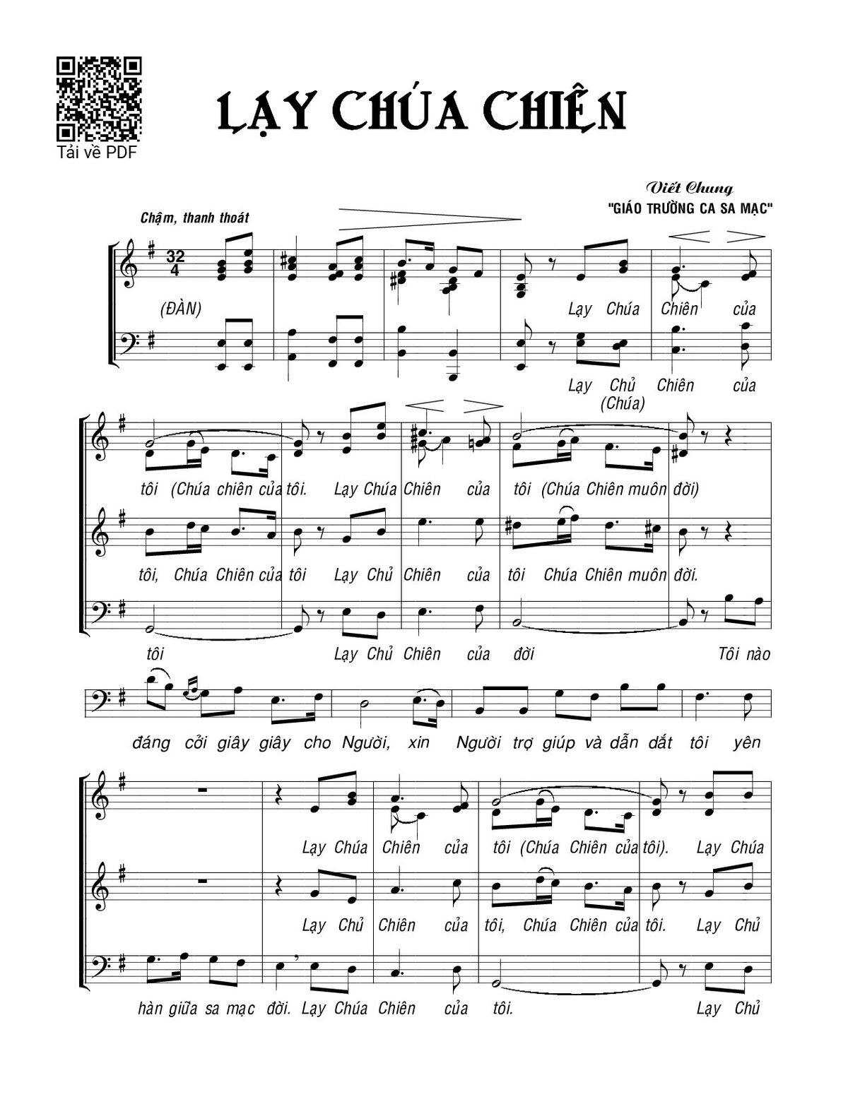 Sheet nhạc có nốt Lạy Chúa Chiên của nhạc sĩ Viết Chung và file PDF nốt nhạc đăng lên đây nhằm giúp các bạn xướng âm cho đúng nốt và hát thêm hay, chỉ mang tính chất tham khảo, không có mục đích thương mại. Bản quyền thuộc về tác giả và tổ chức nắm bản quyền, Truongca.com không giữ bất kỳ bản quyền của nội dung nào cả. Các bạn có thể tải về bản PDF chất lượng cao, gồm khuông nhạc có nốt với đường link file PDF bên trên.