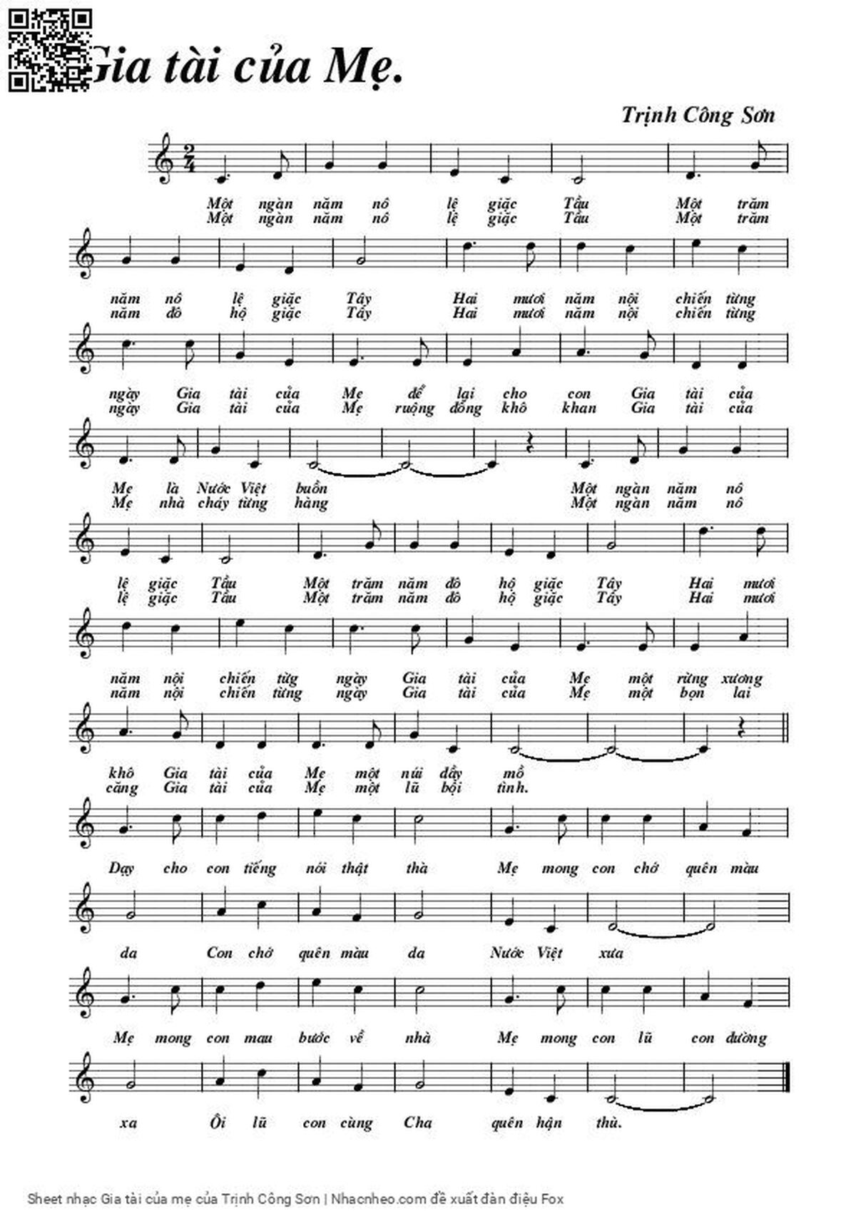 Phần nghe hát Gia tài của mẹ (Trịnh Công Sơn) được nhúng từ Youtube, Musescore hoặc link ngoài và chịu sự kiểm soát bản quyền của bên thứ ba đó, vì vậy có thể bị xóa hoặc chèn quảng cáo bất kỳ lúc nào. Nếu bạn không nghe - xem được ca sĩ hát tức là đã bị Youtube hoặc Musescore kiểm soát.