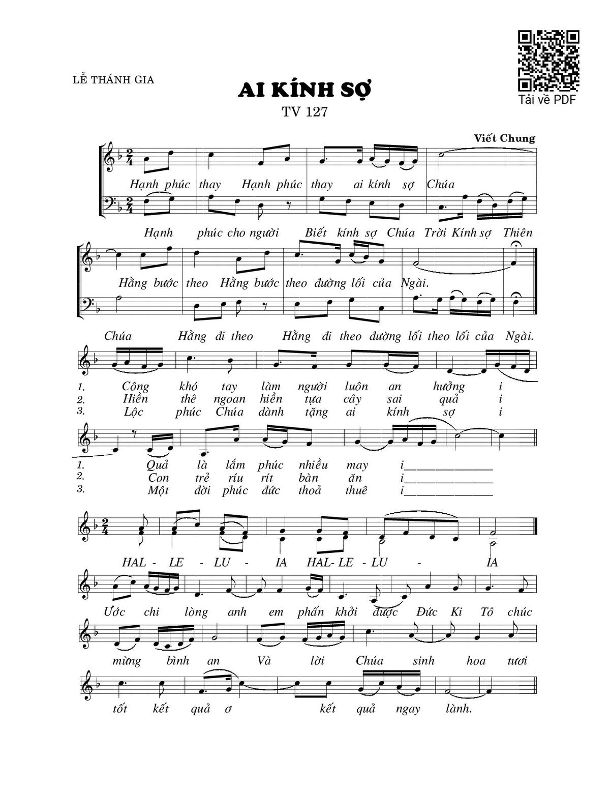 Sheet nhạc có nốt Ai kính sợ (Lễ Thánh Gia) của nhạc sĩ Viết Chung và file PDF nốt nhạc đăng lên đây nhằm giúp các bạn xướng âm cho đúng nốt và hát thêm hay, chỉ mang tính chất tham khảo, không có mục đích thương mại. Bản quyền thuộc về tác giả và tổ chức nắm bản quyền, Truongca.com không giữ bất kỳ bản quyền của nội dung nào cả. Các bạn có thể tải về bản PDF chất lượng cao, gồm khuông nhạc có nốt với đường link file PDF bên trên.