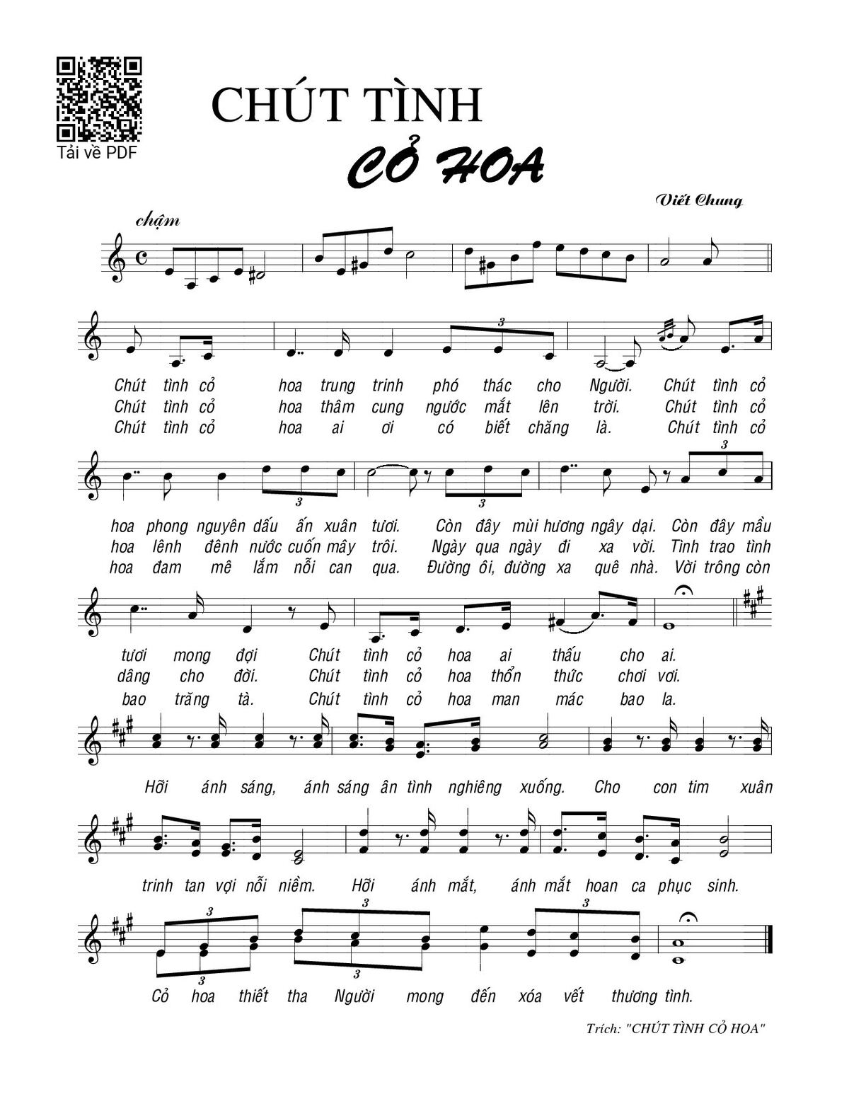 Sheet nhạc có nốt Chút tình cỏ hoa của nhạc sĩ Viết Chung và file PDF nốt nhạc đăng lên đây nhằm giúp các bạn xướng âm cho đúng nốt và hát thêm hay, chỉ mang tính chất tham khảo, không có mục đích thương mại. Bản quyền thuộc về tác giả và tổ chức nắm bản quyền, Truongca.com không giữ bất kỳ bản quyền của nội dung nào cả. Các bạn có thể tải về bản PDF chất lượng cao, gồm khuông nhạc có nốt với đường link file PDF bên trên.