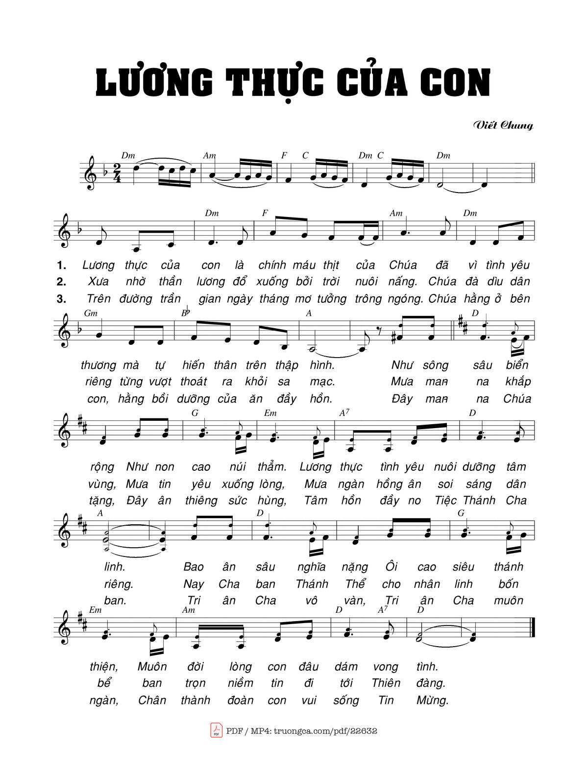 1. Lương thực của con là chính Máu Thịt của Chúa. Đã vì tình yêu thương mà tự hiến thân trên thập hình. Như sông sâu biển rộng như non cao núi thẳm lương thực tình yêu nuôi dưỡng tâm linh. Bao ân sâu nghĩa nặng ôi cao siêu thánh thiện muôn đời lòng con đâu dám vong tình.