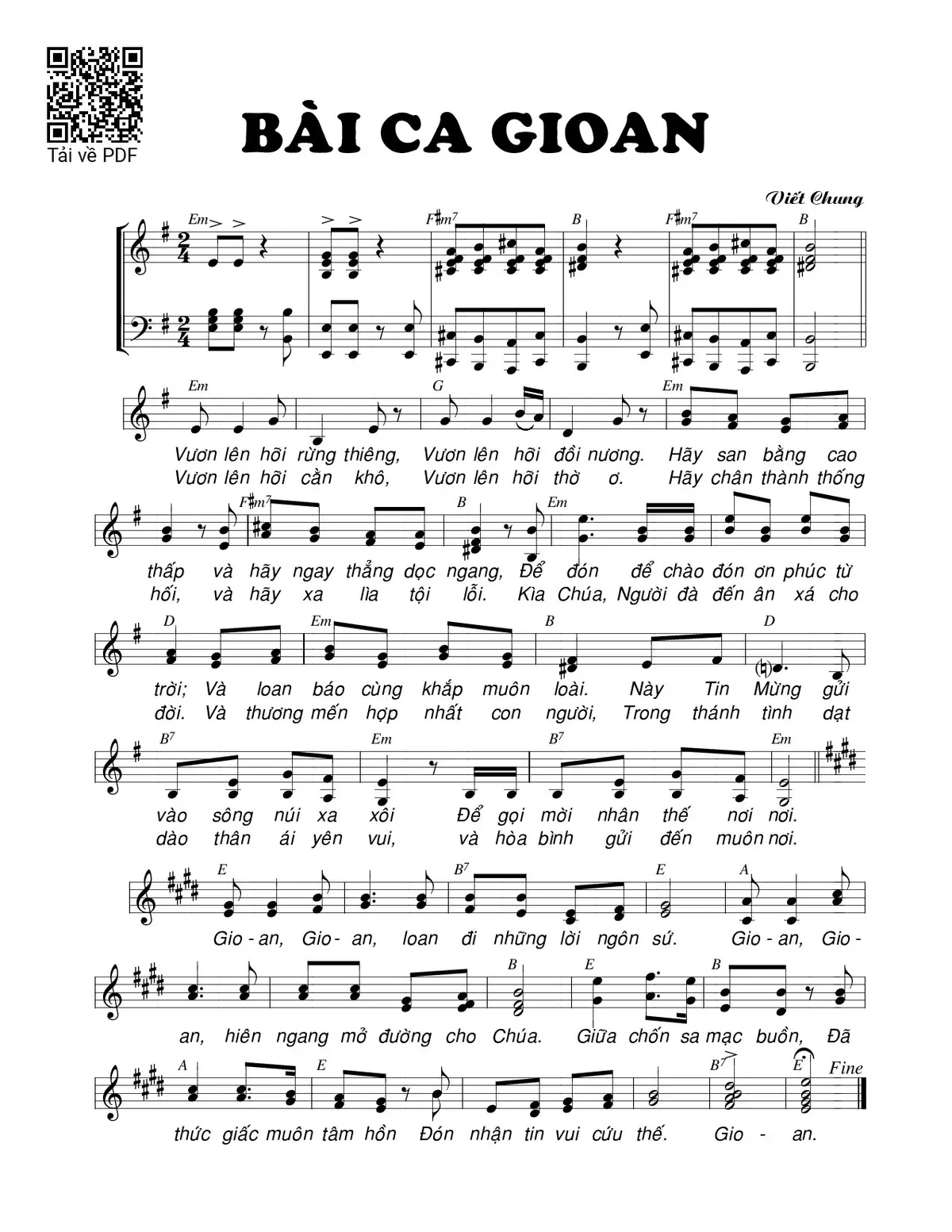 Sheet nhạc có nốt Bài ca Gioan của nhạc sĩ Viết Chung và file PDF nốt nhạc đăng lên đây nhằm giúp các bạn xướng âm cho đúng nốt và hát thêm hay, chỉ mang tính chất tham khảo, không có mục đích thương mại. Bản quyền thuộc về tác giả và tổ chức nắm bản quyền, Truongca.com không giữ bất kỳ bản quyền của nội dung nào cả. Các bạn có thể tải về bản PDF chất lượng cao, gồm khuông nhạc có nốt với đường link file PDF bên trên.