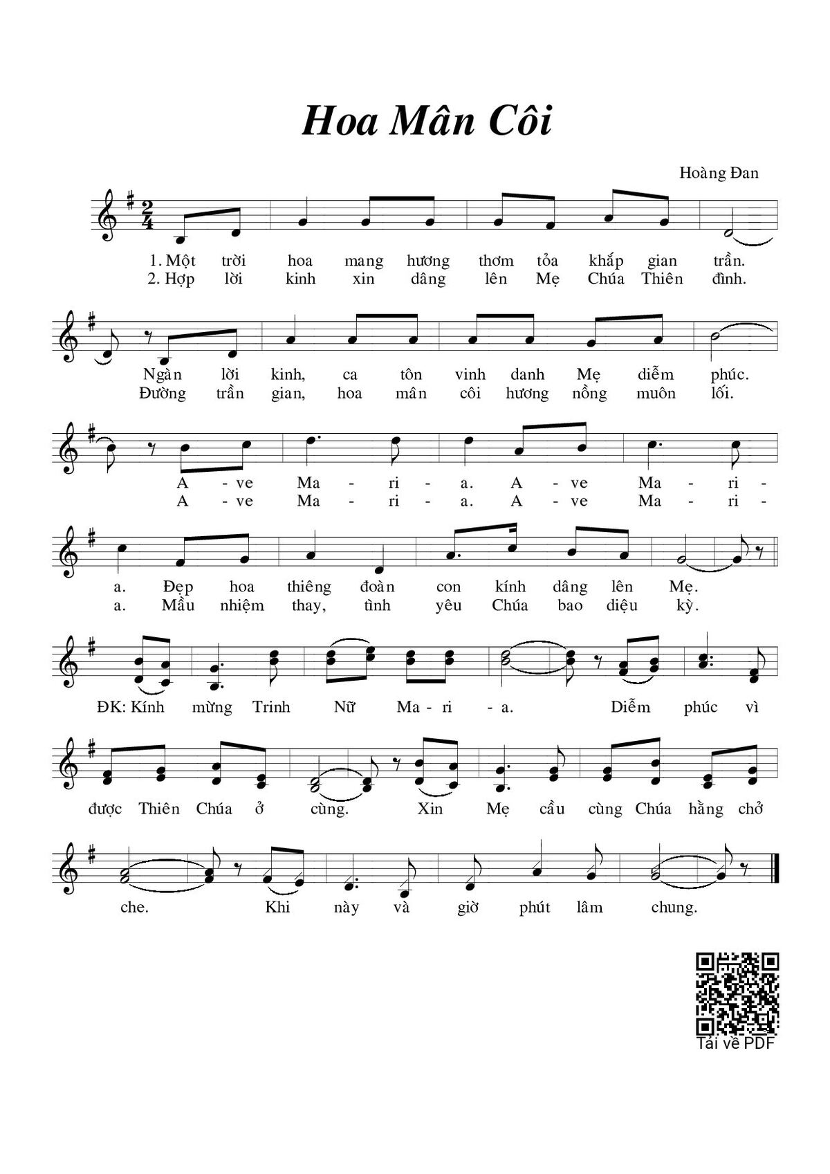 1. Một trời hoa mang hương thơm tỏa khắp gian trần. Ngàn lời kinh ca tôi vinh danh Mẹ diễm phúc. Ave Maria. Ave Maria đẹp hoa thiêng đoàn con kính dâng lên Mẹ.