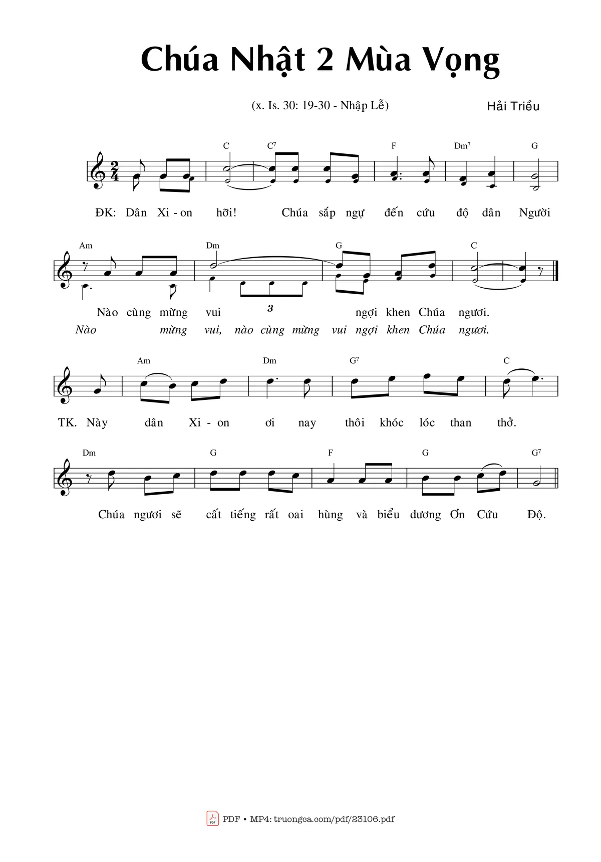 Điệp khúc. Dân Xi-on hỡi! Chúa sắp ngự đến cứu độ dân Người. Nào cùng mừng vui ngợi khen Chúa ngươi.