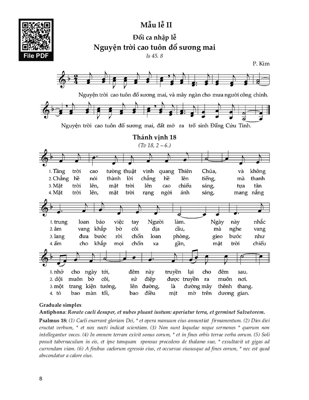 Đáp ca: Nguyện trời cao tuôn đổ sương mai, và mây ngàn cho mưa người công chính. Nguyện trời cao tuôn đổ sương mai, đất mở ra trổ sinh Đấng Cứu Tinh.