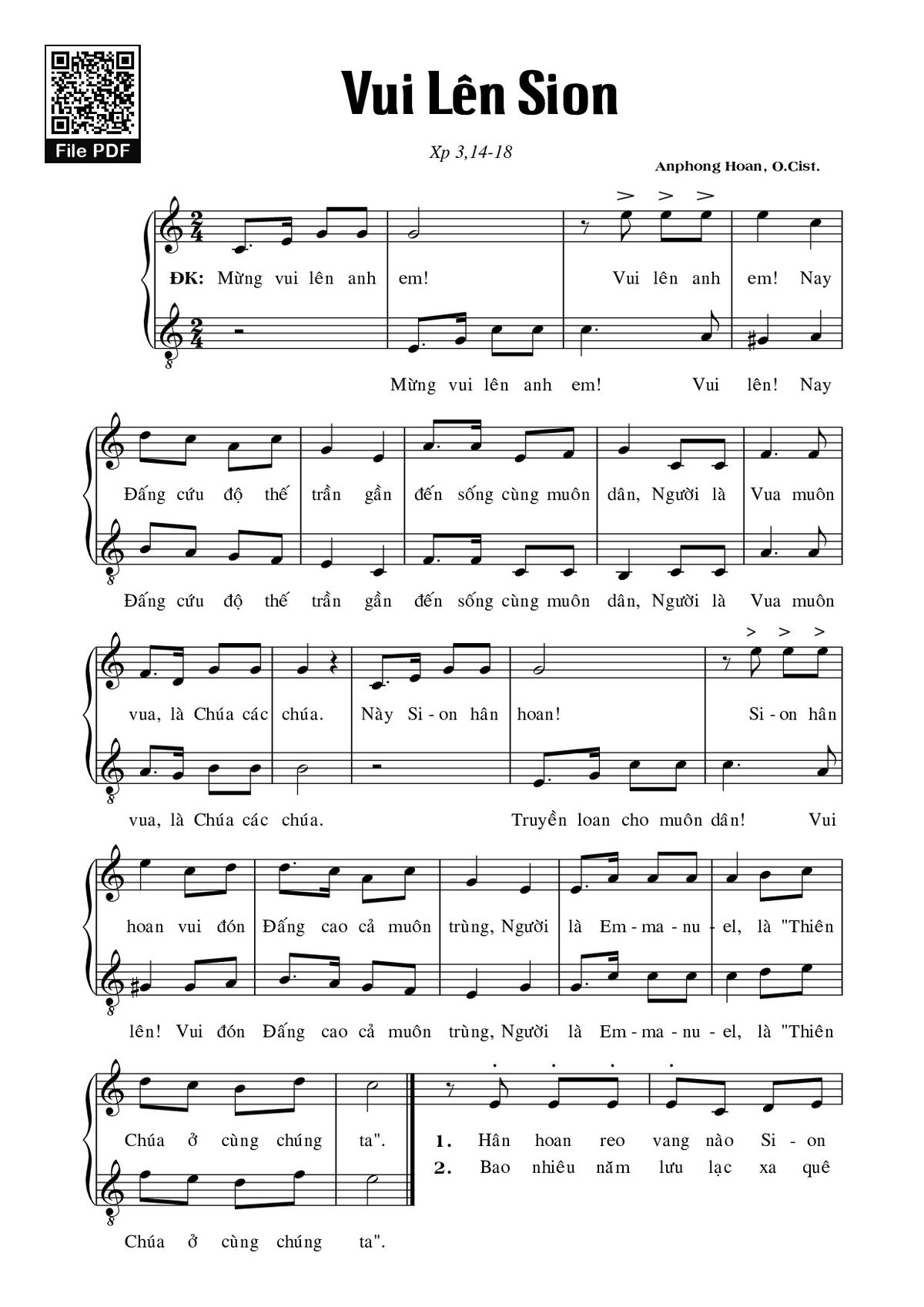 Điệp khúc: Mừng vui lên anh em! Vui lên anh em! Nay Đấng cứu độ thế trần gần đến sống cùng muôn dân, Người là Vua muôn vua, là Chúa các chúa. Này Si-on hân hoan! Si-on hân hoan vui đón Đấng cao cả muôn trùng, Người là Em-ma-nu-el, là “Thiên Chúa ở cùng chúng ta”.