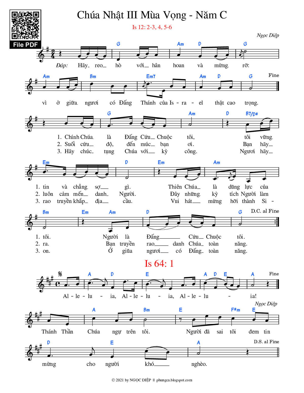 Ngọc Diệp Hãy reo hò với hân hoan và mừng rỡ Vì ở giữa ngươi có Đấng Thánh của Israel thật cao trọng [PDF] [Sheet] [Lời H.A] [Mp4/Midi]