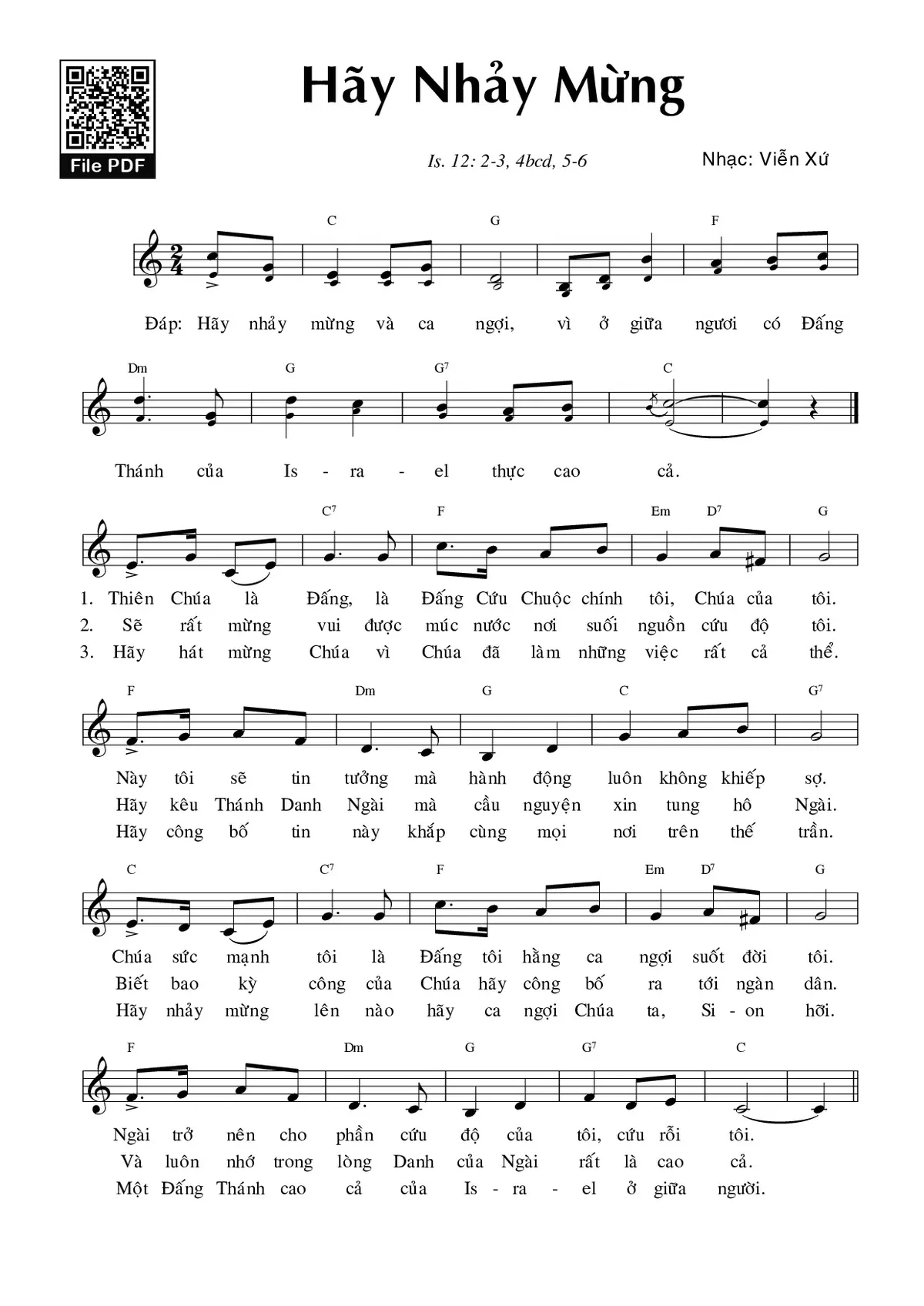 1. Thiên Chúa là Đấng, là Đấng Cứu Chuộc chính tôi, Chúa của tôi. Này tôi sẽ tin tưởng mà hành động luôn không khiếp sợ. Chúa sức mạnh tôi là Đấng tôi hằng ca ngợi suốt đời tôi. Ngài trở nên cho phần cứu độ của tôi, cứu rỗi tôi.