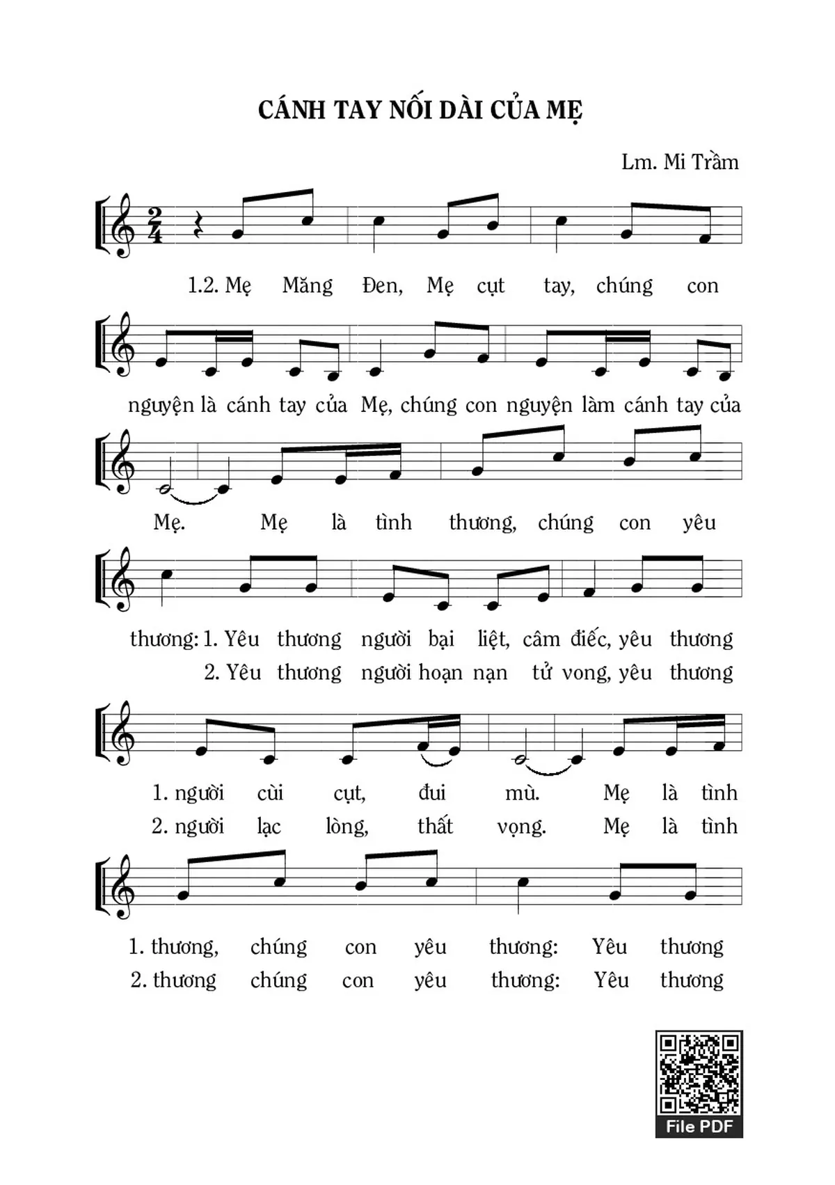 Điệp khúc. Chính chúng con là những cánh tay nối dài nối dài, dù Mẹ không tay, tay Mẹ vẫn dài, dù Mẹ không tay, tay Mẹ vẫn vươn xa. Chính chúng con là những cánh tay nối dài nối dài, dù Mẹ không tay, tay Mẹ vẫn dài, dù Mẹ không tay, tay Mẹ vẫn vươn xa.
