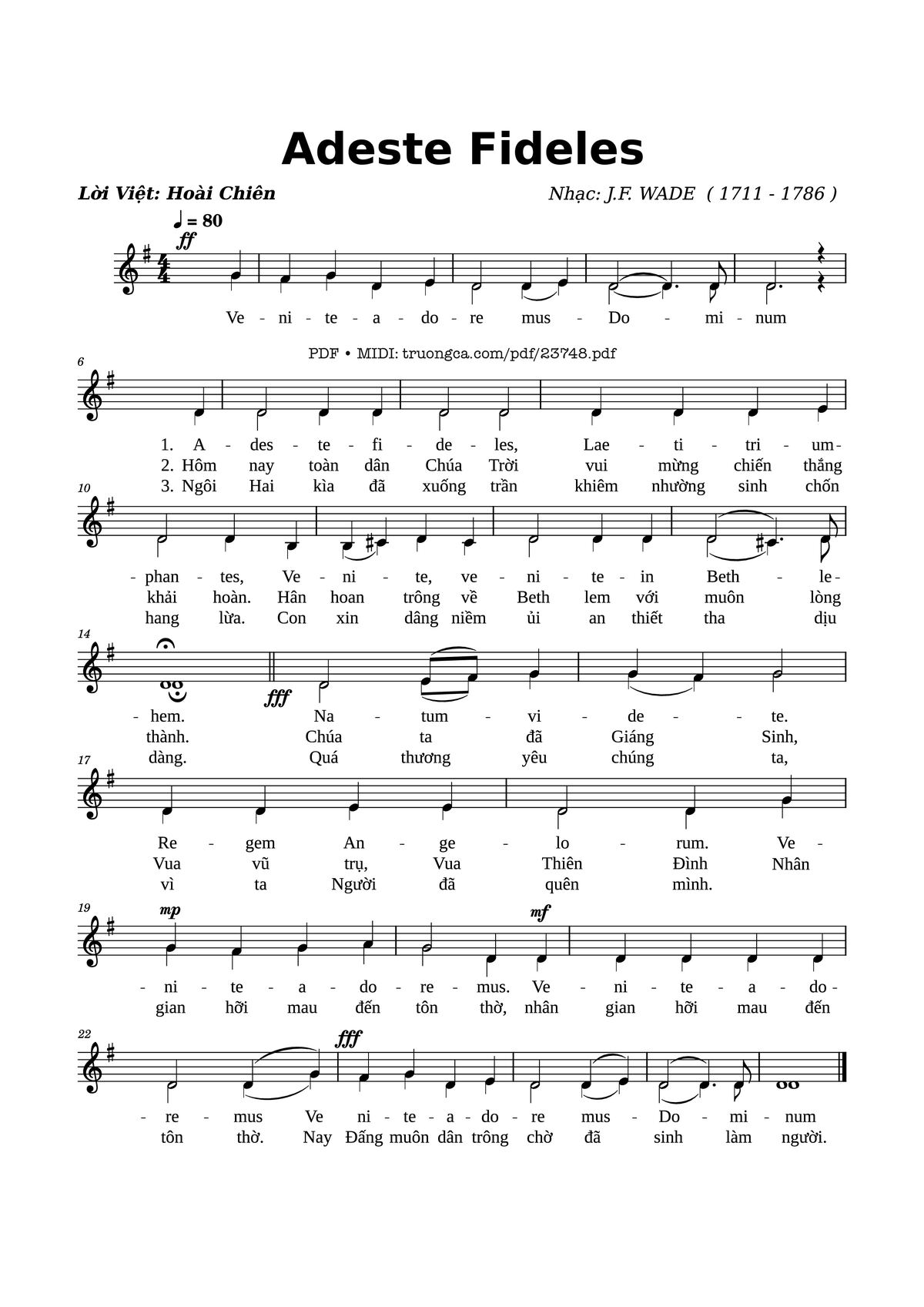 Phần nghe hát Adeste Fideles (J.F. WADE) được nhúng từ Youtube, Musescore hoặc link ngoài và chịu sự kiểm soát bản quyền của bên thứ ba đó, vì vậy có thể bị xóa hoặc chèn quảng cáo bất kỳ lúc nào. Nếu bạn không nghe - xem được ca sĩ hát tức là đã bị Youtube hoặc Musescore kiểm soát.
