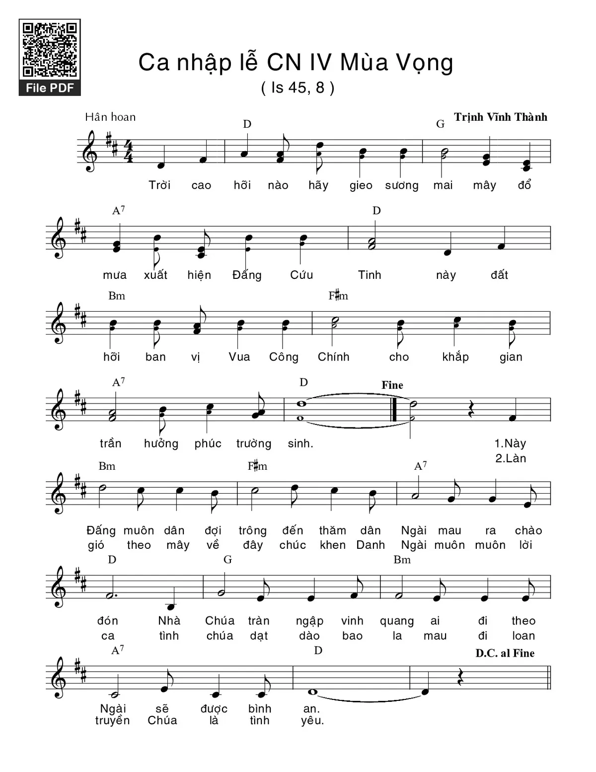 Điệp khúc. Trời cao hỡi nào hãy gieo sương mai, mây đổ mưa xuất hiện Đấng Cứu Tinh. Này đất hỡi ban vị Vua Công Chính, cho khắp gian trần hưởng phúc trường sinh.