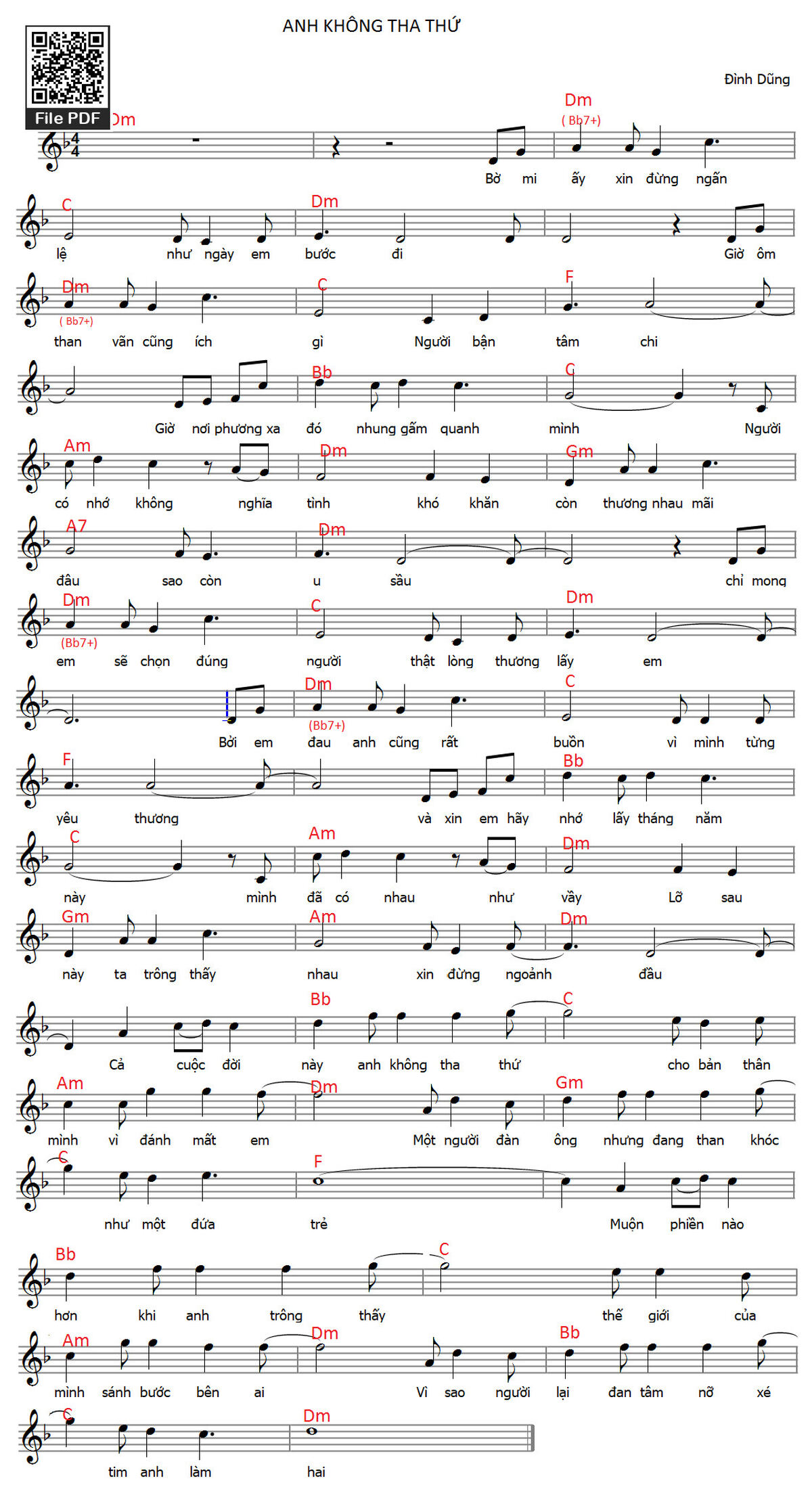 Chọn nút dấu + để tăng tông lên nửa cung, nút dấu - để giảm tông xuống nửa cung. Rê chuột vào hợp âm để xem các thế bấm hợp âm của bài hát Anh không tha thứ.