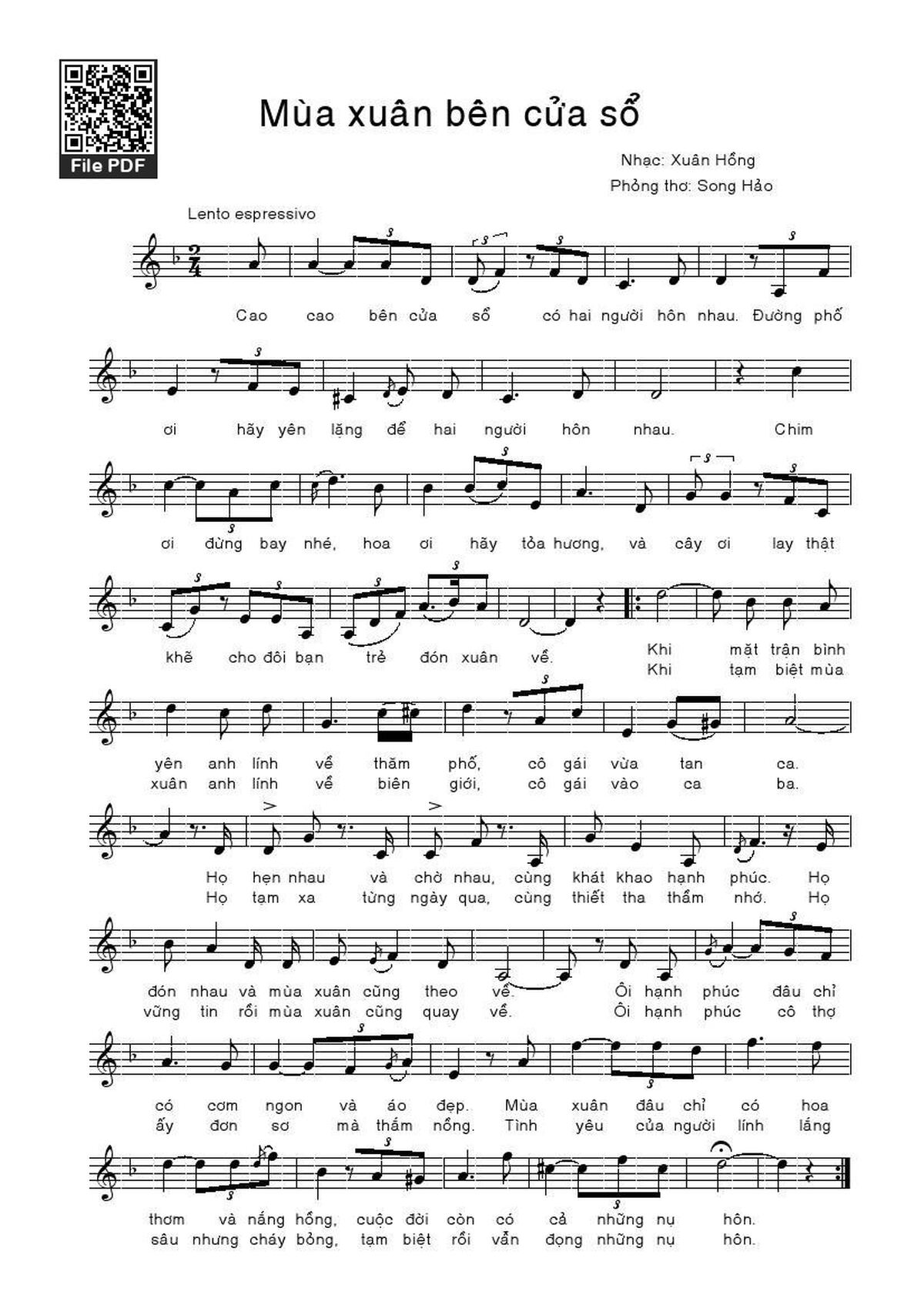Sheet nhạc có nốt Mùa Xuân Bên Cửa Sổ của nhạc sĩ Song Hảo và file PDF nốt nhạc đăng lên đây nhằm giúp các bạn xướng âm cho đúng nốt và hát thêm hay, chỉ mang tính chất tham khảo, không có mục đích thương mại. Bản quyền thuộc về tác giả và tổ chức nắm bản quyền, Truongca.com không giữ bất kỳ bản quyền của nội dung nào cả. Các bạn có thể tải về bản PDF chất lượng cao, gồm khuông nhạc có nốt với đường link file PDF bên trên.