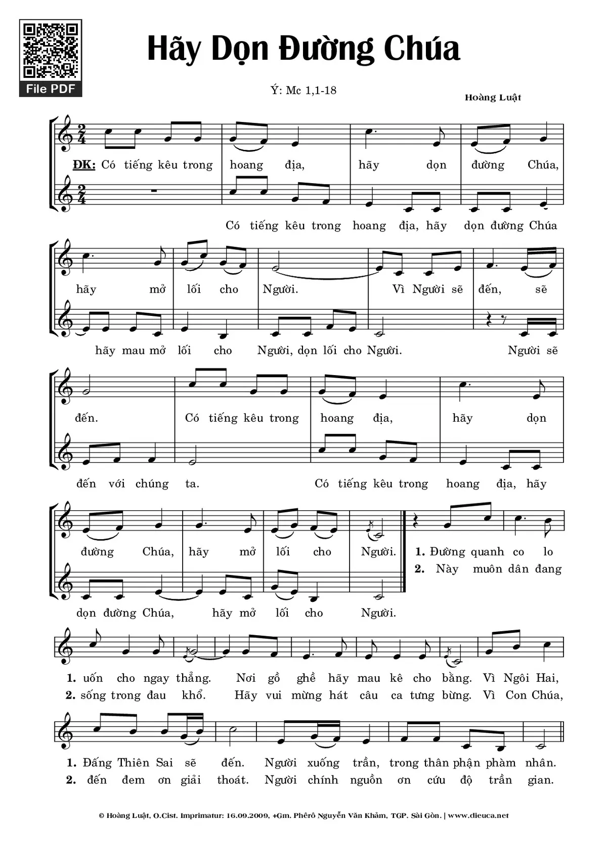 Điệp khúc: Có tiếng kêu trong hoang địa, hãy dọn đường Chúa, hãy mở lối cho Người. Vì Người sẽ đến, sẽ đến. Có tiếng kêu trong hoang địa, hãy dọn đường Chúa, hãy mở lối cho Người.