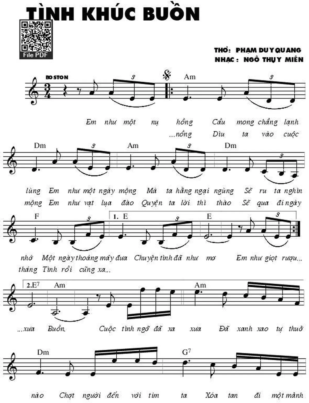 Sheet nhạc có nốt Tình Khúc Buồn của nhạc sĩ Phạm Duy Quang và file PDF nốt nhạc đăng lên đây nhằm giúp các bạn xướng âm cho đúng nốt và hát thêm hay, chỉ mang tính chất tham khảo, không có mục đích thương mại. Bản quyền thuộc về tác giả và tổ chức nắm bản quyền, Truongca.com không giữ bất kỳ bản quyền của nội dung nào cả. Các bạn có thể tải về bản PDF chất lượng cao, gồm khuông nhạc có nốt với đường link file PDF bên trên.