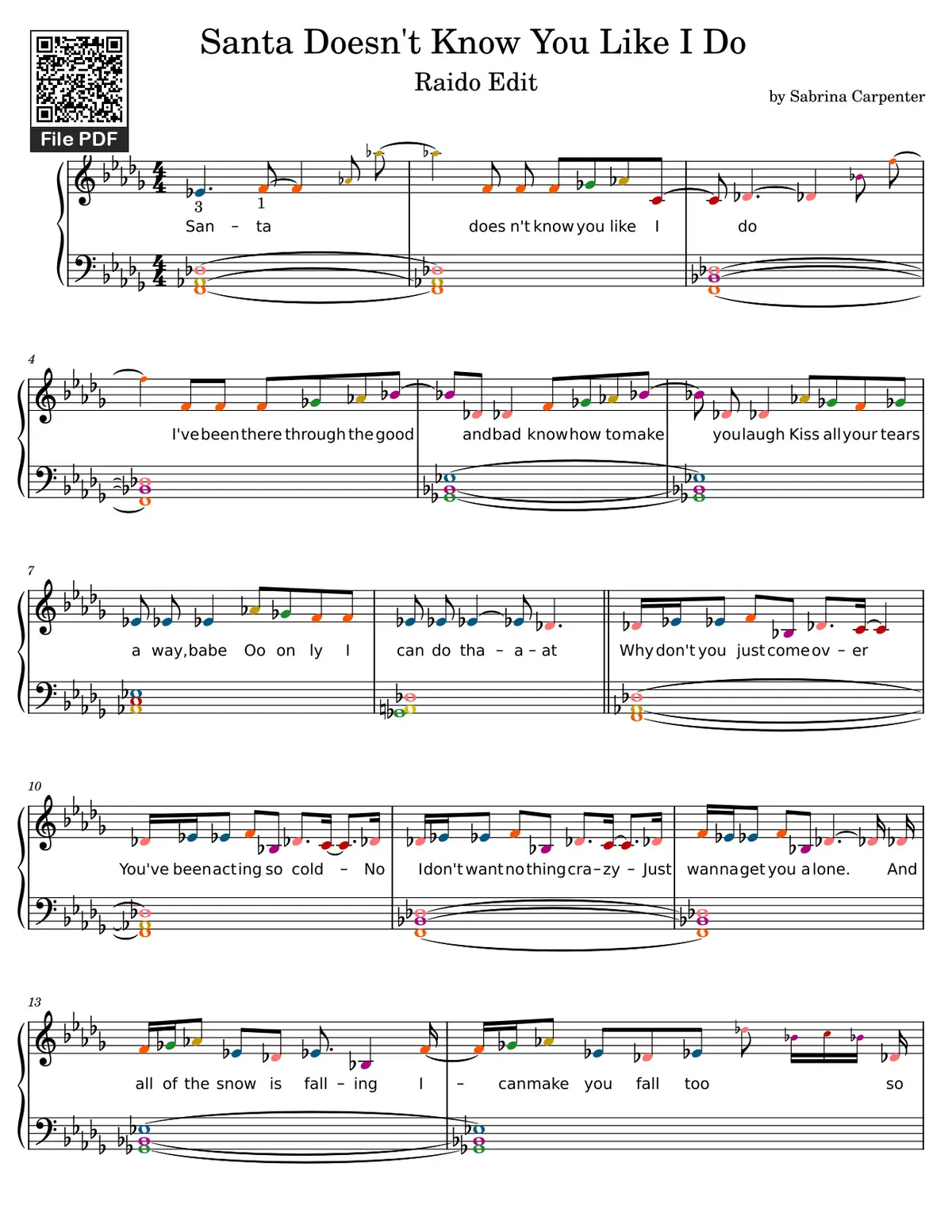 Phần đàn mẫu Santa Doesn't Know You Like I Do Sheet Piano ( by Sabrina Carpenter) được nhúng từ Youtube, Musescore hoặc link ngoài và chịu sự kiểm soát bản quyền của bên thứ ba đó, vì vậy có thể bị xóa hoặc chèn quảng cáo bất kỳ lúc nào. Nếu bạn không nghe - xem được phần đàn mẫu hát mẫu tức là đã bị Youtube/Musescore kiểm soát.