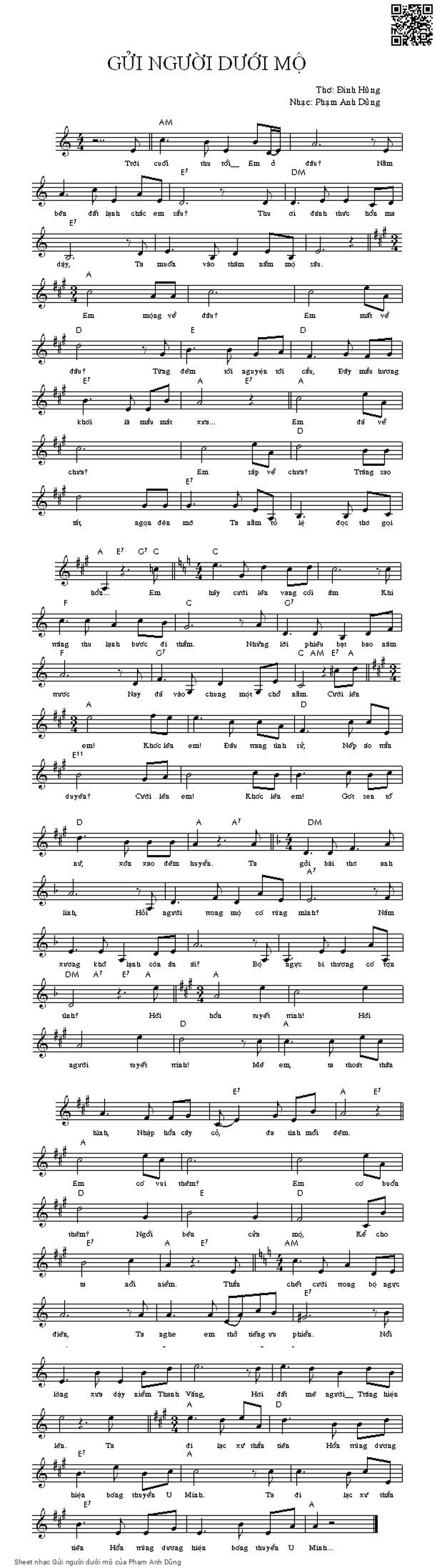 Chọn nút dấu + để tăng tông lên nửa cung, nút dấu - để giảm tông xuống nửa cung. Rê chuột vào hợp âm để xem các thế bấm hợp âm của bài hát Gửi người dưới mộ.