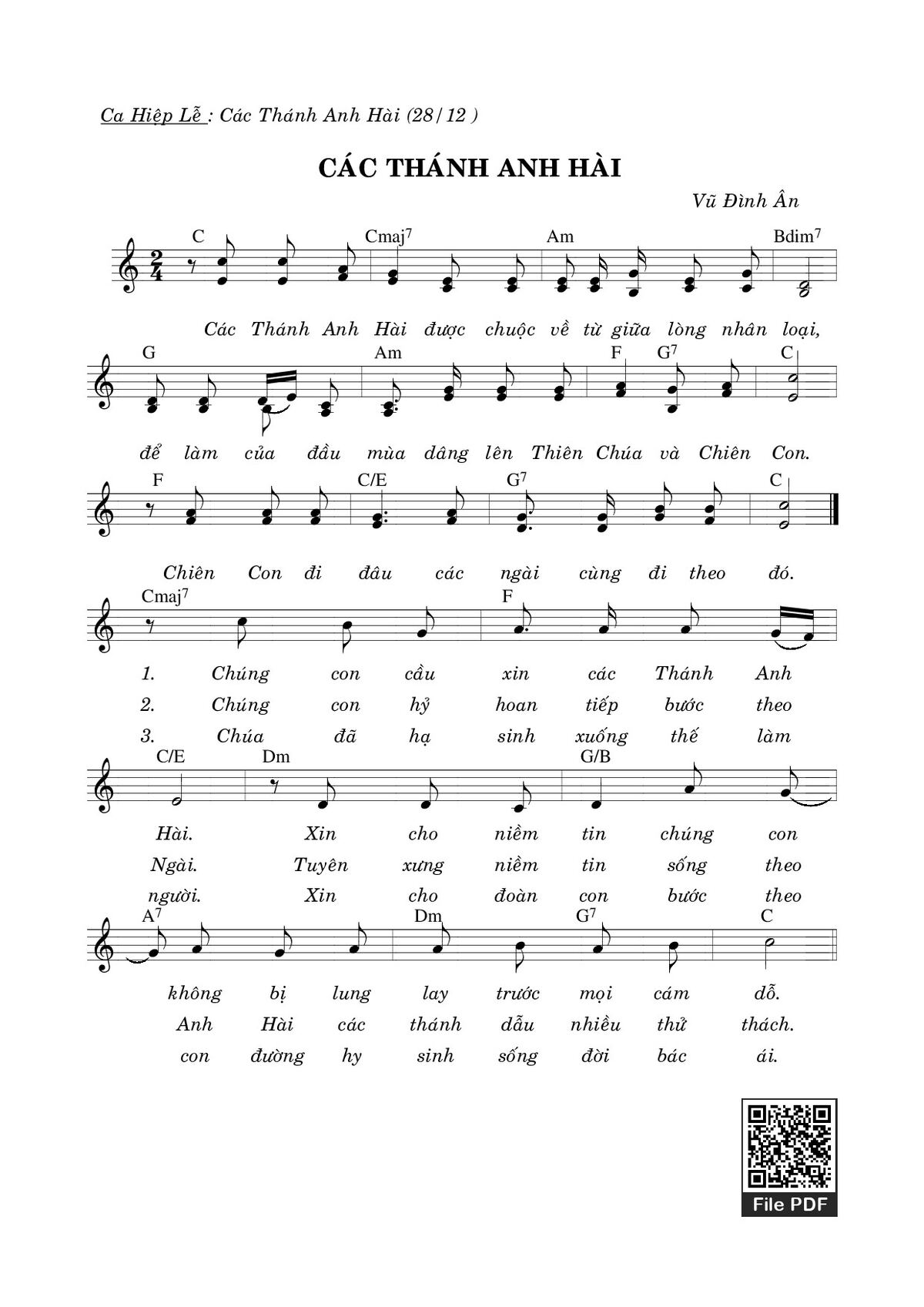 Phần nghe hát Các Thánh Anh Hài (Vũ Đình Ân) được nhúng từ Youtube, Musescore hoặc link ngoài và chịu sự kiểm soát bản quyền của bên thứ ba đó, vì vậy có thể bị xóa hoặc chèn quảng cáo bất kỳ lúc nào. Nếu bạn không nghe - xem được ca sĩ hát tức là đã bị Youtube hoặc Musescore kiểm soát.