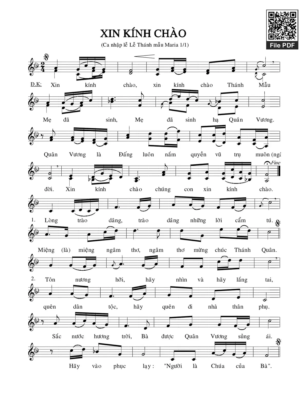 Điệp khúc. Xin kính chào, xin kính chào Thánh Mẫu. Mẹ đã sinh, Mẹ đã sinh hạ Quân Vương. Quân Vương là Đấng luôn nắm quyền vũ trụ muôn (ngàn) đời. Xin kính chào, chúng con xin kính chào.
