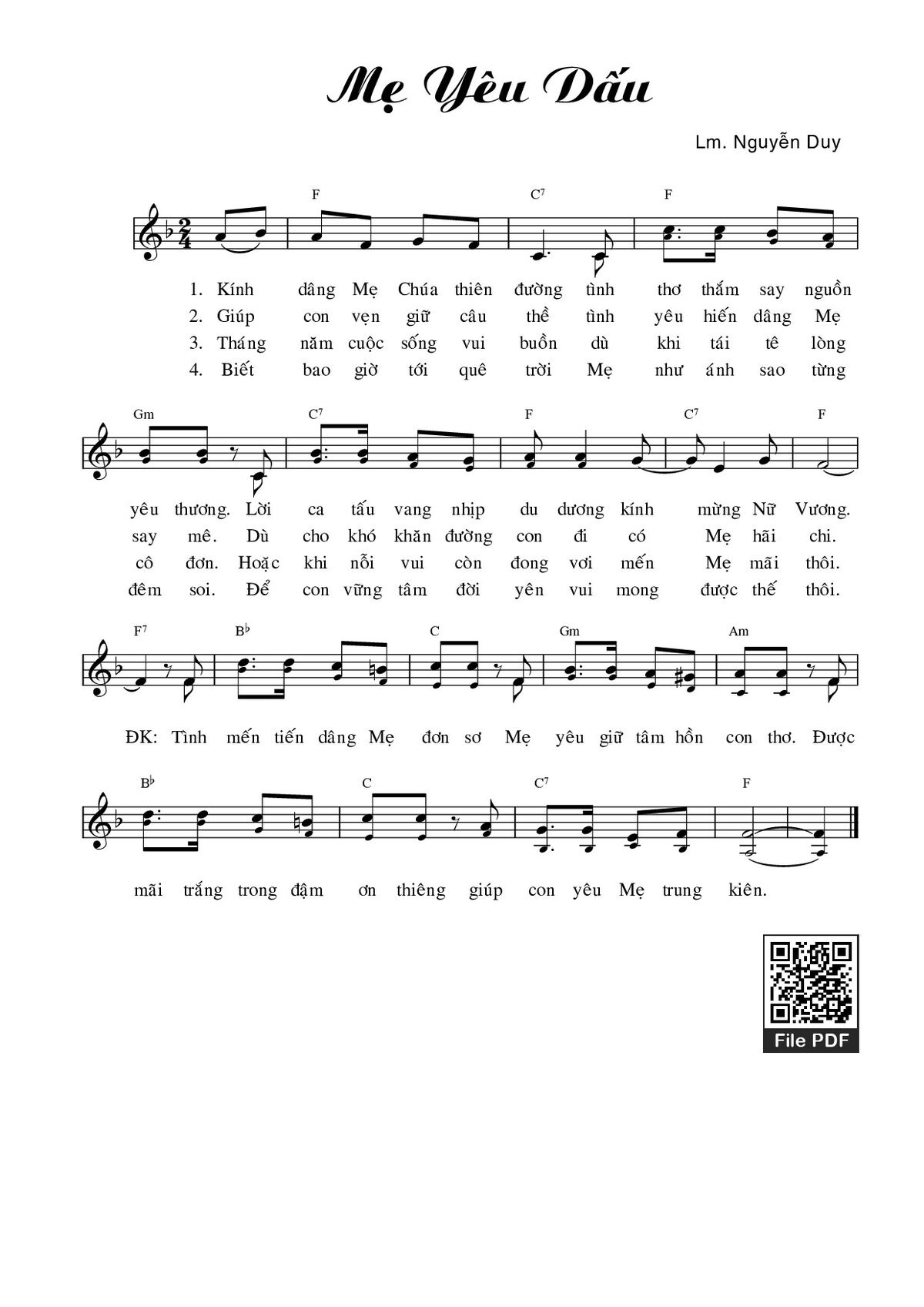 Điệp khúc. Tình mến tiến dâng Mẹ đơn sơ, Mẹ yêu giữ tâm hồn con thơ được mãi trắng trong đậm ơn thiêng, giúp con yêu Mẹ trung kiên.
