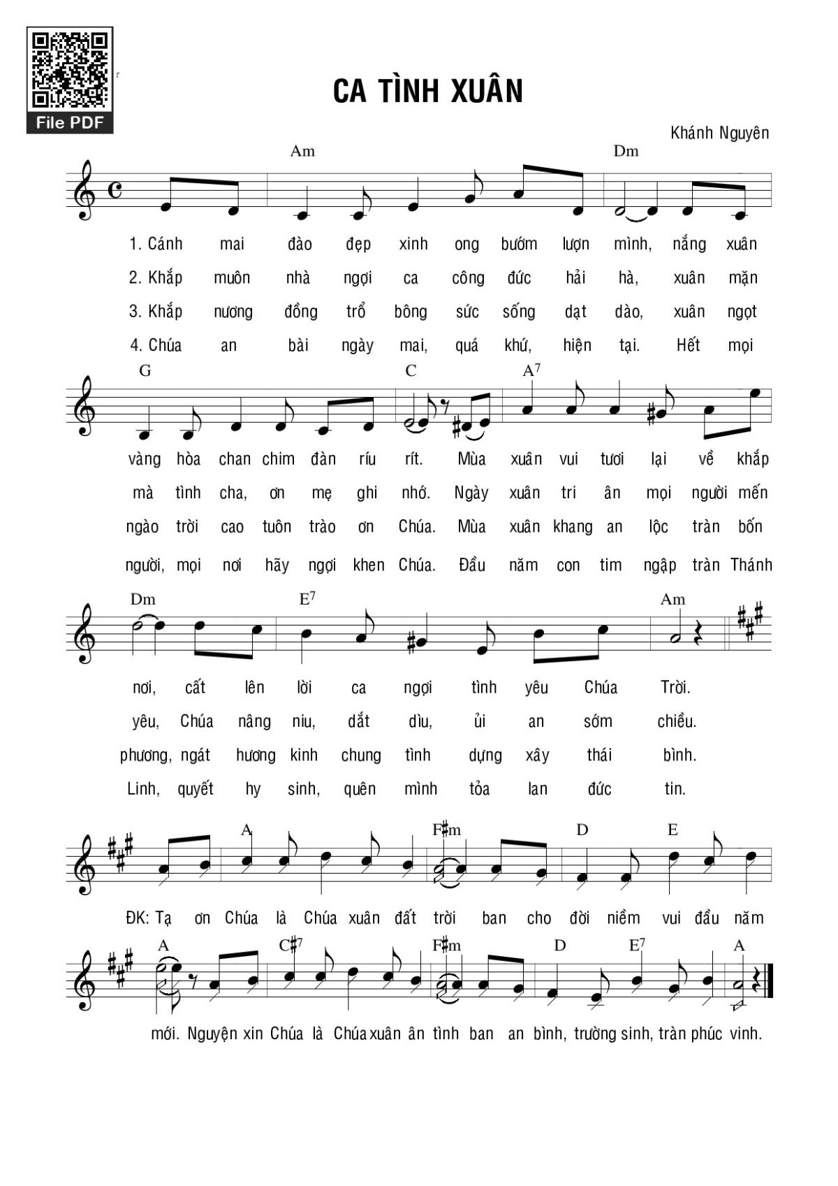 Sheet nhạc có nốt Ca tình xuân của nhạc sĩ Khánh Nguyên và file PDF nốt nhạc đăng lên đây nhằm giúp các bạn xướng âm cho đúng nốt và hát thêm hay, chỉ mang tính chất tham khảo, không có mục đích thương mại. Bản quyền thuộc về tác giả và tổ chức nắm bản quyền, Truongca.com không giữ bất kỳ bản quyền của nội dung nào cả. Các bạn có thể tải về bản PDF chất lượng cao, gồm khuông nhạc có nốt với đường link file PDF bên trên.